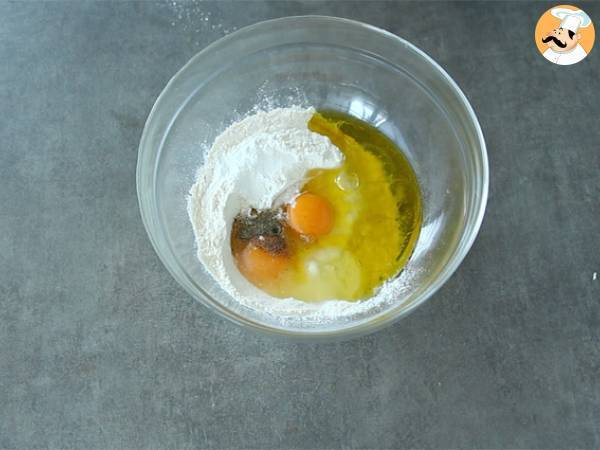 Amestecati ouale, făina, praful, uleiul de masline, sarea și piperul.