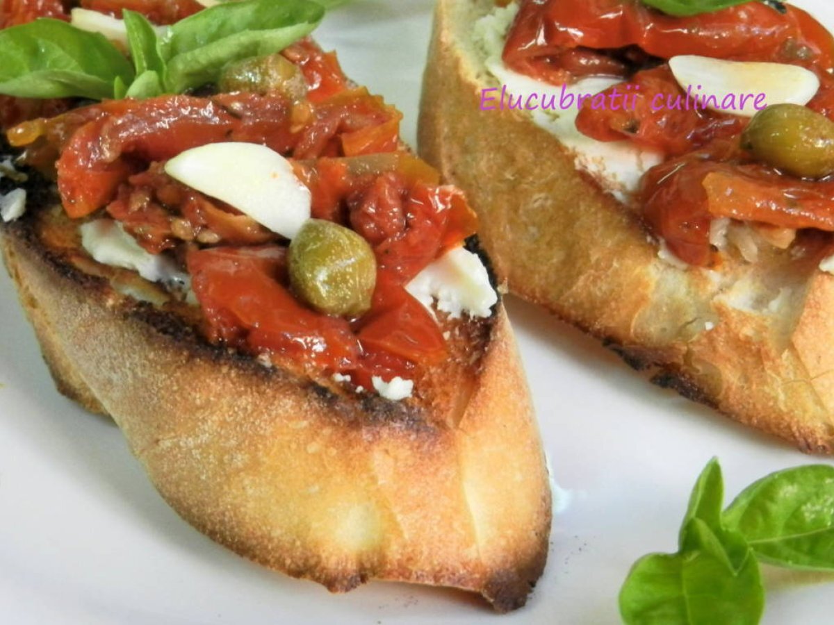 Bruschete cu roșii uscate și busuioc PrecedentulUrmătorul AntreuriFoarte ușor12 min Trimite unui prieten Printează pagina Adresează o întrebare autorului Postează o poză cu rețeta gătită de tine Varianta rapida ;) Ingrediente 4 1 baghetă 1 borcan roșii uscate în ulei 1 căpățănă de usturoi Frunze de busuioc proaspete Unt Sare Capere