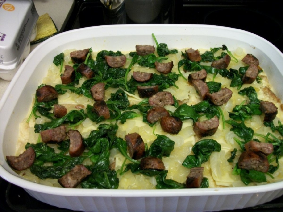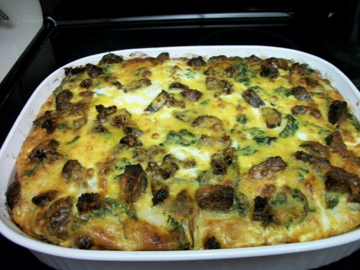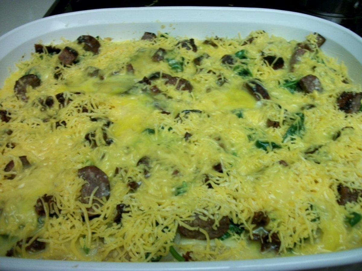 Carnati cu spanac la cuptor PrecedentulUrmătorul AntreuriUșor1 h 30 m Trimite unui prieten Printează pagina Adresează o întrebare autorului Postează o poză cu rețeta gătită de tine Carnati, spanac, oua. Ingrediente 6 600 grame paine mai veche taiata in bucati 10 oua 230 ml lapte sau smantana 230 grame branza rasa (cascaval, branza cheddar, parmezan, emental – o combinatie a acestora sau orice branza rasa doriti) 200 grame carnati , bacon sau sunca taiati in bucati sau cubulete 1 ceapa mare tocata cubulete 200 grame ciuperci feliate 300 grame spanac tanar crud