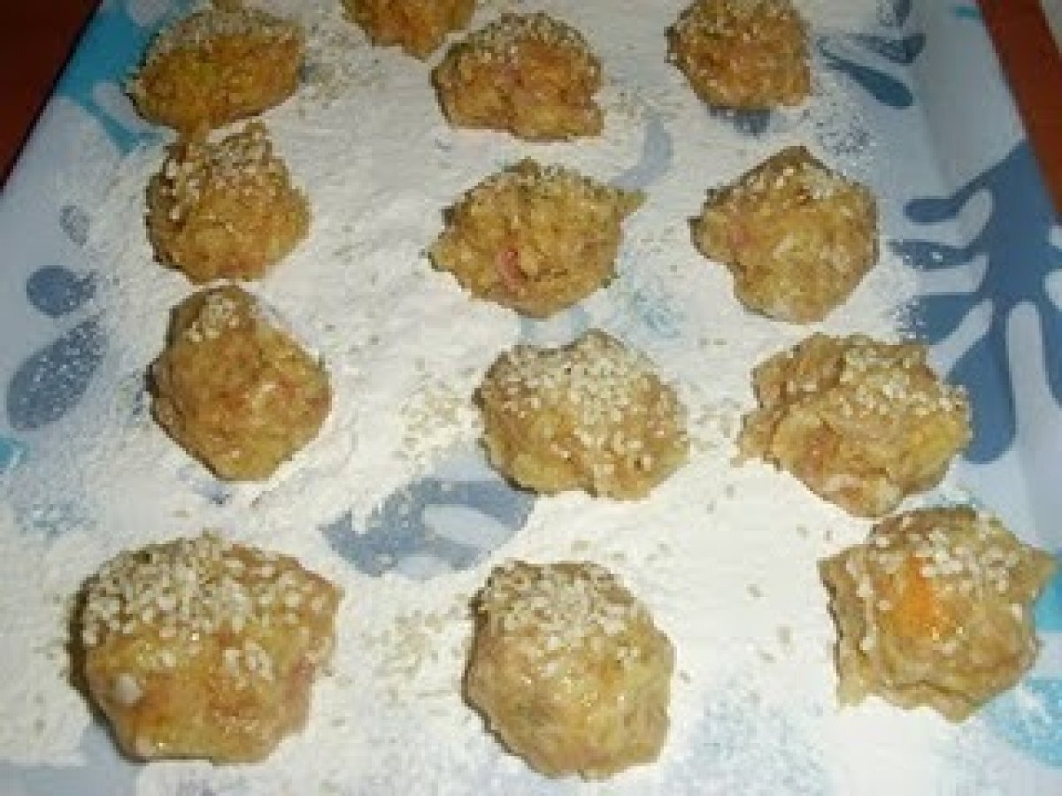 Chiftelute de pui cu susan PrecedentulUrmătorul AntreuriUșor45 min Trimite unui prieten Printează pagina Adresează o întrebare autorului Postează o poză cu rețeta gătită de tine Ingrediente 4 pentru compozitie:1/2 kg carne tocata de pui ( eu folosesc doar pieptul de pui), 1 ou,1 ceapa,1 morcov,patrunjel,cimbru, miezul de la o felie de paine inmuiat in 50 gr lapte ( merge si apa), sare,piper. pentru prajire: faina, susan alb ( cca 100 gr), ulei