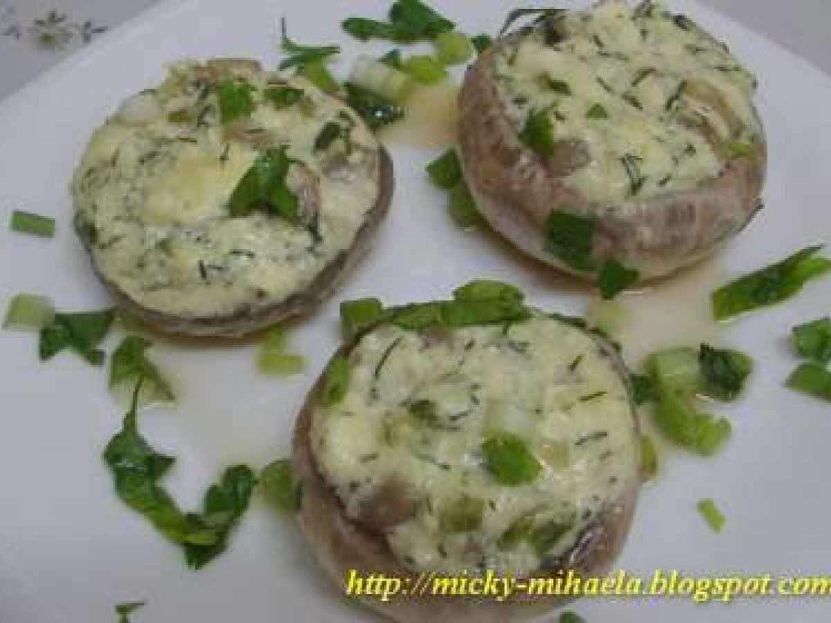 Ciuperci umplute cu branza de vaci AntreuriFoarte ușor40 min Trimite unui prieten Printează pagina Adresează o întrebare autorului Postează o poză cu rețeta gătită de tine Ingrediente 3 9 ciuperci mari, 200 g branza de vaci, 1 lingura cu unt, 1 lingura cu ulei, 3 fire de ceapa verde, 1 catel de usturoi, 1/2 legatura de marar, 2 oua, sare, piper, ornare: ceapa verde si patrunjel.