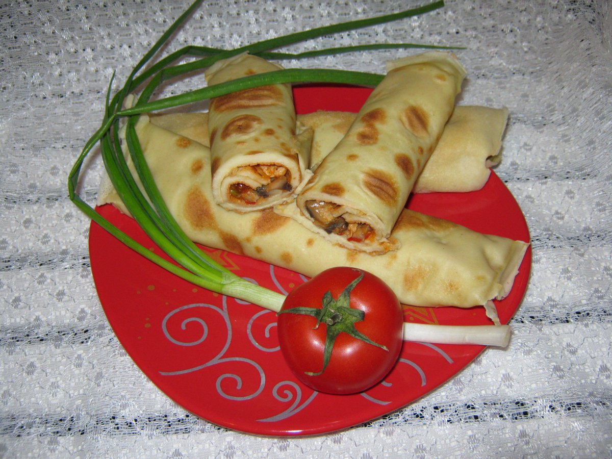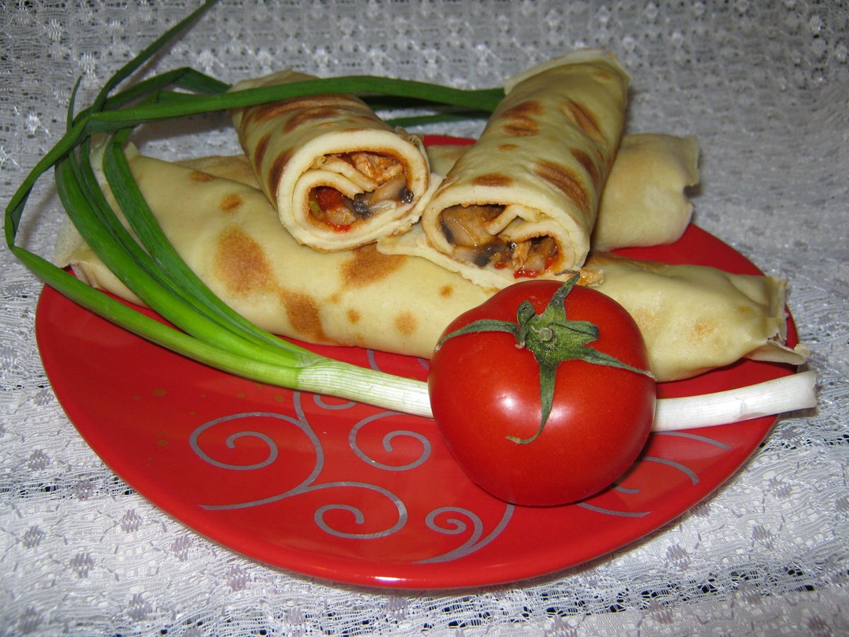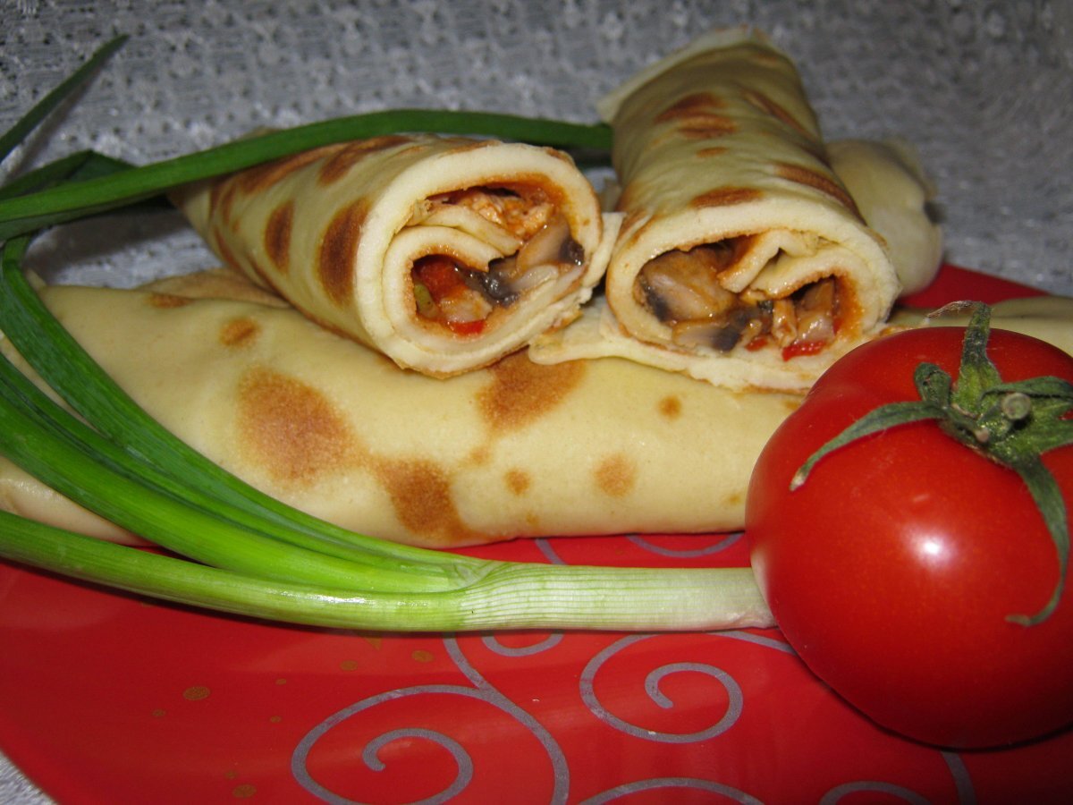 Clatite cu pui si legume PrecedentulUrmătorul AntreuriUșor50 min Trimite unui prieten Printează pagina Adresează o întrebare autorului Postează o poză cu rețeta gătită de tine Ingrediente 4 * Pt clatite: 6 oua, 1 litru apa minerala sau sifon, un praf de sare, faina. * Pt umplutura: 500 gr piept de pui, 5 ciuperci, 1 ardei kapia, 1 dovlecel, 4 linguri sos de rosii, oregano, sare, piper, busuioc, boia dulce, condimente pt pui, 2 lingurite sos soia. * Pt servire: ceapa verde, rosii mici.