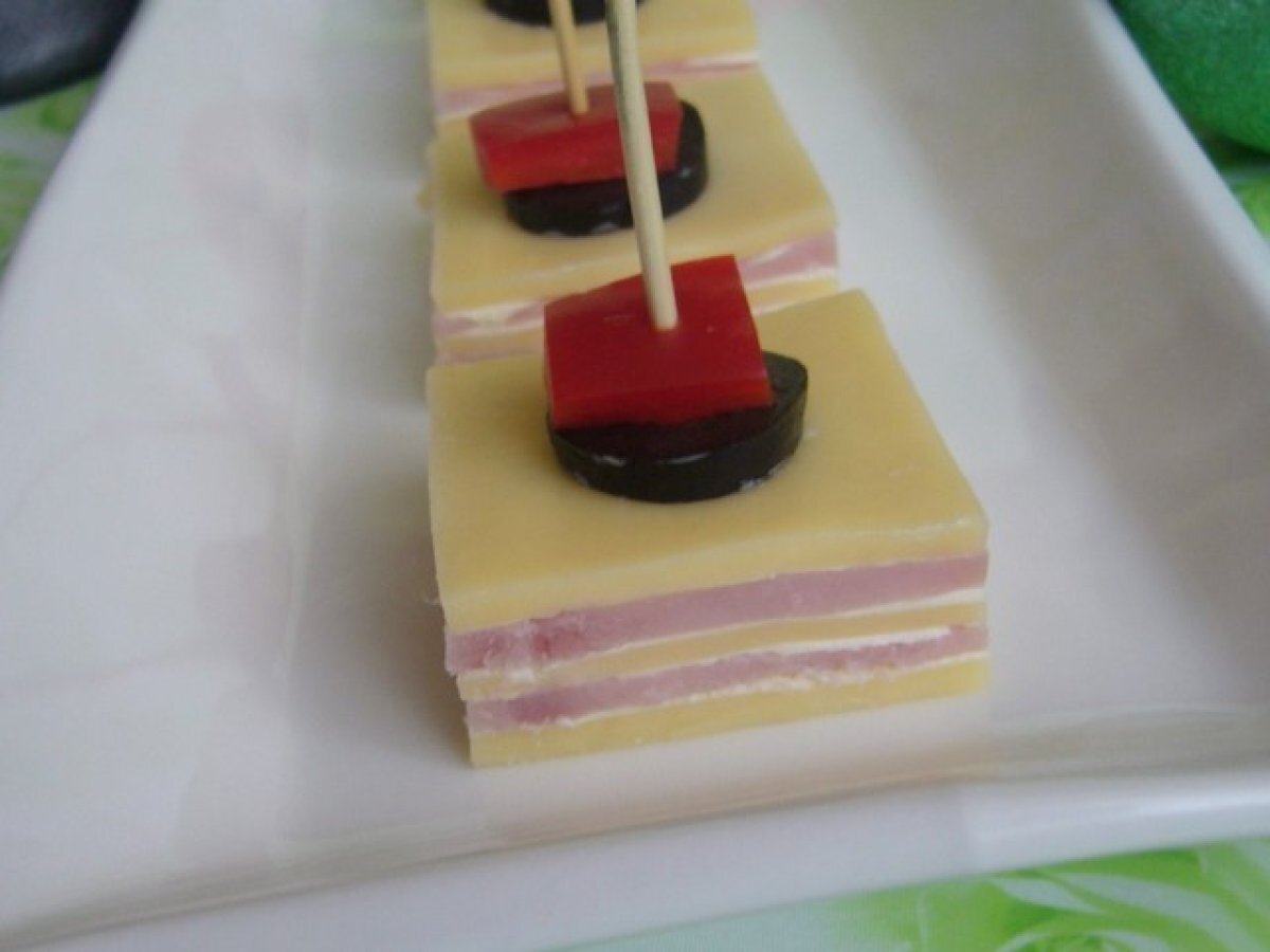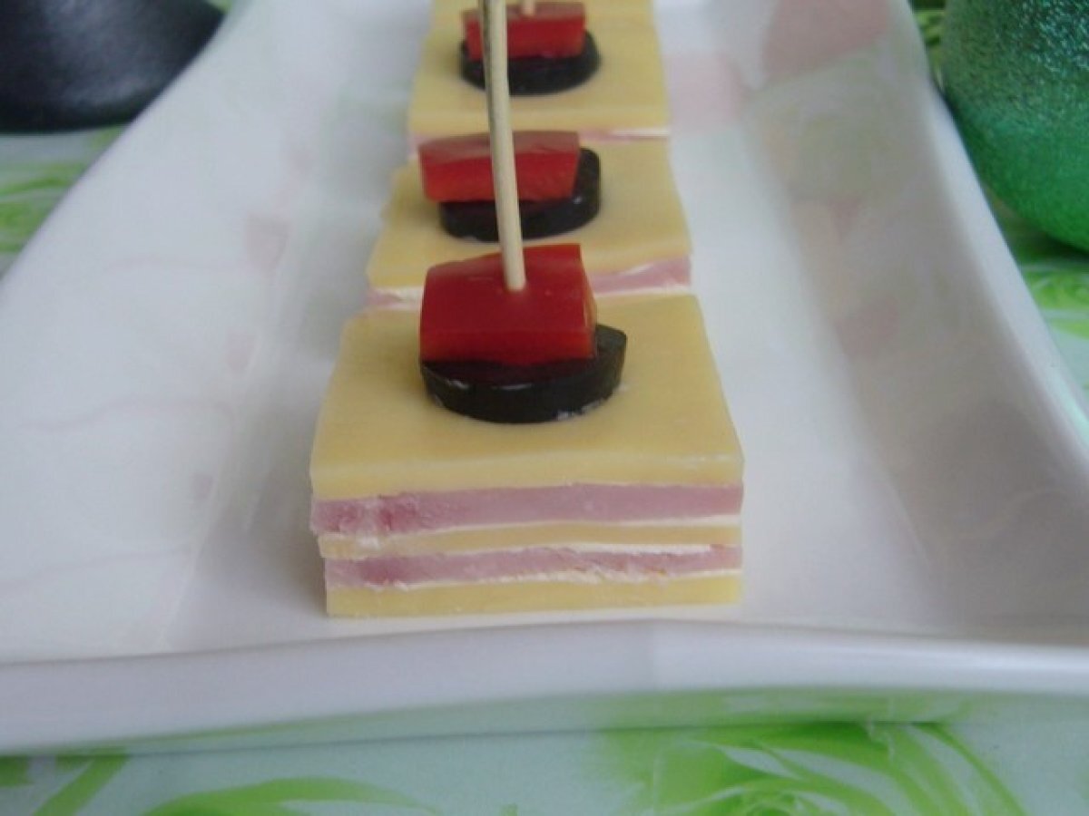 Dobos aperitiv cu sunca si cascaval PrecedentulUrmătorul AntreuriFoarte ușor10 min Trimite unui prieten Printează pagina Adresează o întrebare autorului Postează o poză cu rețeta gătită de tine Ingrediente 2 3 felii cascaval (Gouda) 4 felii sunca (Praga) unt Decor: masline fara samburi ardei rosu