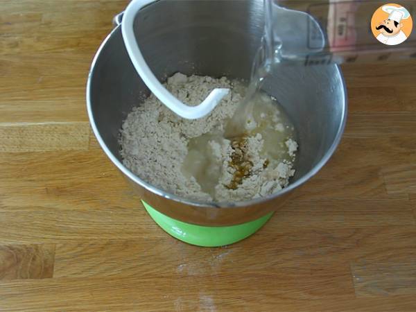In castronul robotului puneti faina, sarea si formati o gropita in care puneti drojdia sfaramata (aveti grija, pentru ca drojdia nu trebuie sa atinga sarea!) Adăugati uleiul de masline si apa si framantati 5 minute.