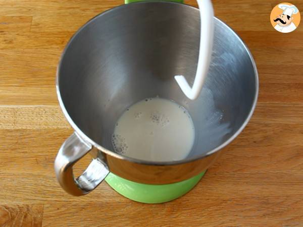 Puneti drojdia uscata in vasul robotului și diluati-o cu laptele caldut. Lasati sa stea 10 minute la temperatura camerei.