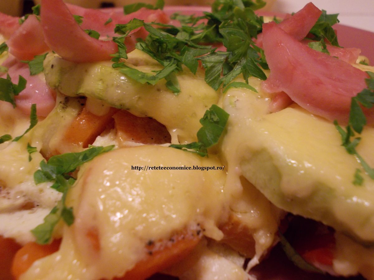Legume gratinate cu sunca si cascaval PrecedentulUrmătorul AntreuriFoarte ușor1 h 15 m Trimite unui prieten Printează pagina Adresează o întrebare autorului Postează o poză cu rețeta gătită de tine Gustos si delicios Ingrediente 3 2 dovlecei 2 morcovi medii 2 cepe un ardei gras 50 g smantana 2 oua 150 g sunca 200 g cascaval o legatura patrunjel 2 linguri ulei masline sare piper.