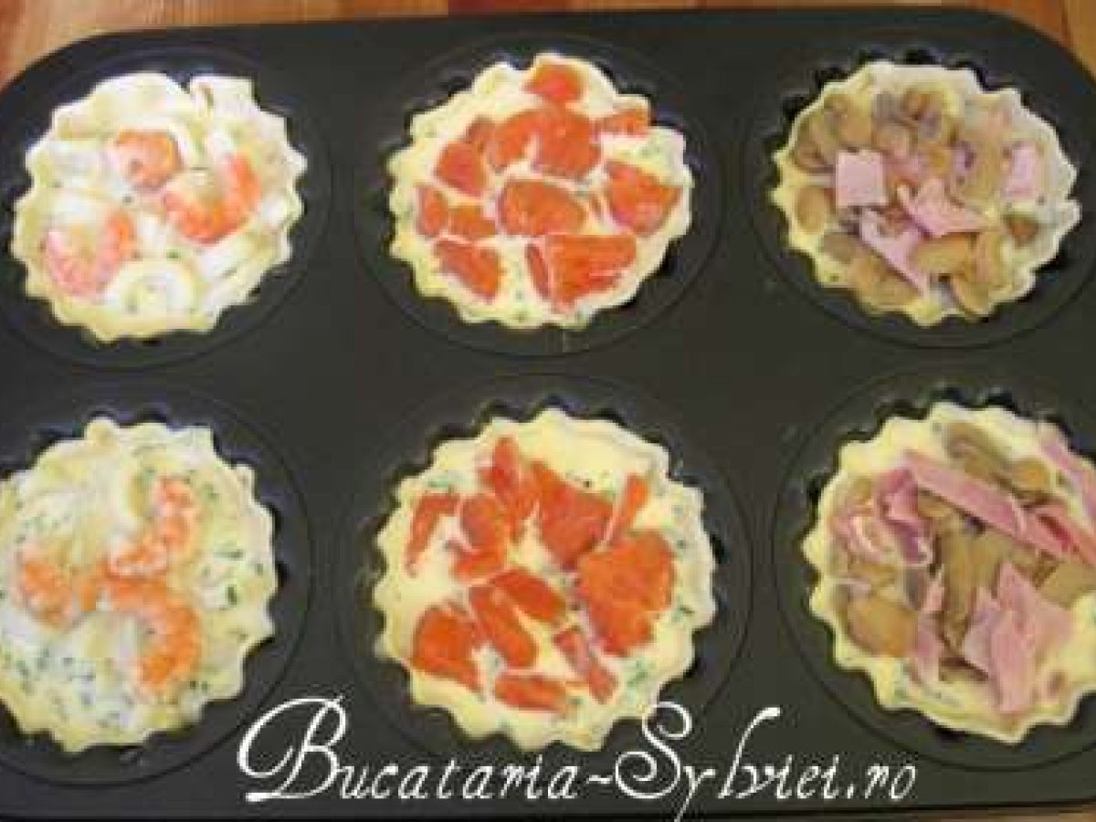 Mini quiche PrecedentulUrmătorul AntreuriUșor40 min Trimite unui prieten Printează pagina Adresează o întrebare autorului Postează o poză cu rețeta gătită de tine Ingrediente 6 Avem nevoie de o foaie pentru tarte sarate, de data asta am folosit foaie cumparata pentru ca eram in graba mare, un ou, 2 linguri de cascaval ras, o lingura plina de smantana grasa ( de 30% am pus eu ) , sare, piper, verdeturi asortate ( eu am pus ceva amestec care le avea pe toate inclusiv usturoi deshidratat). Pentru garnisit cele 6 mini quiche am folosit de daca asta : cativa creveti si calamar ( pt cele cu fructe de mare ) , 150 de grame de somon crud neafumat ( am facut 2 cu somon) si putina sunca si ciuperci pentru alte 2 bucati.