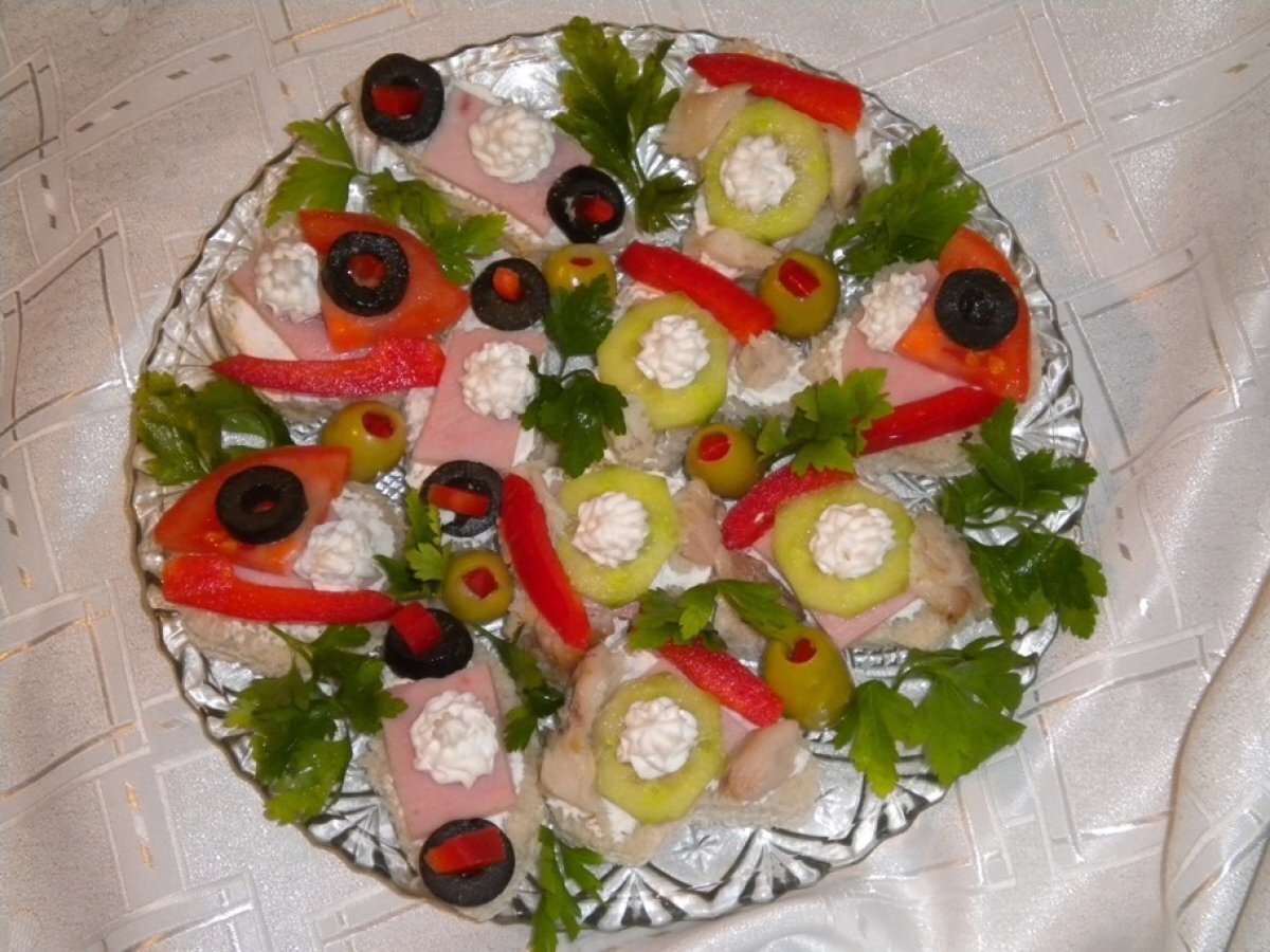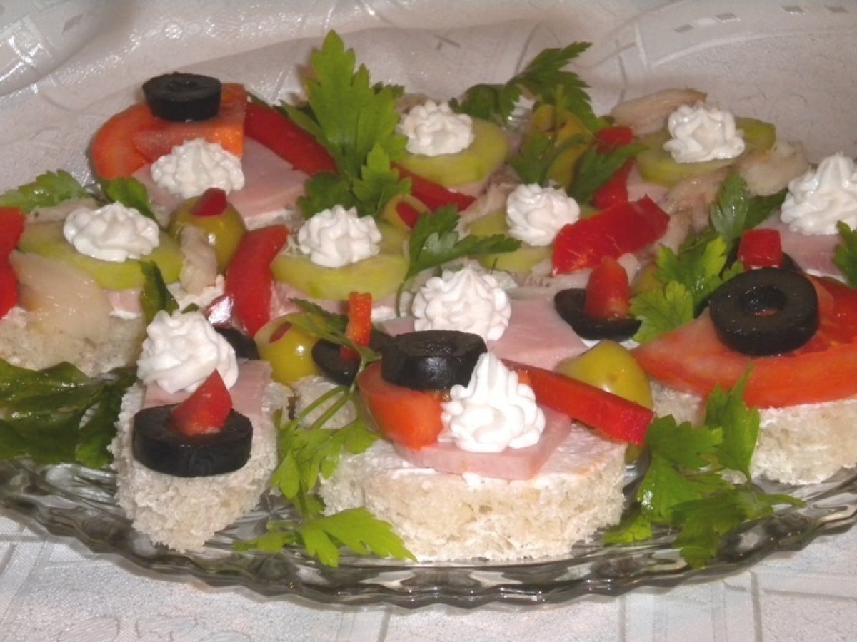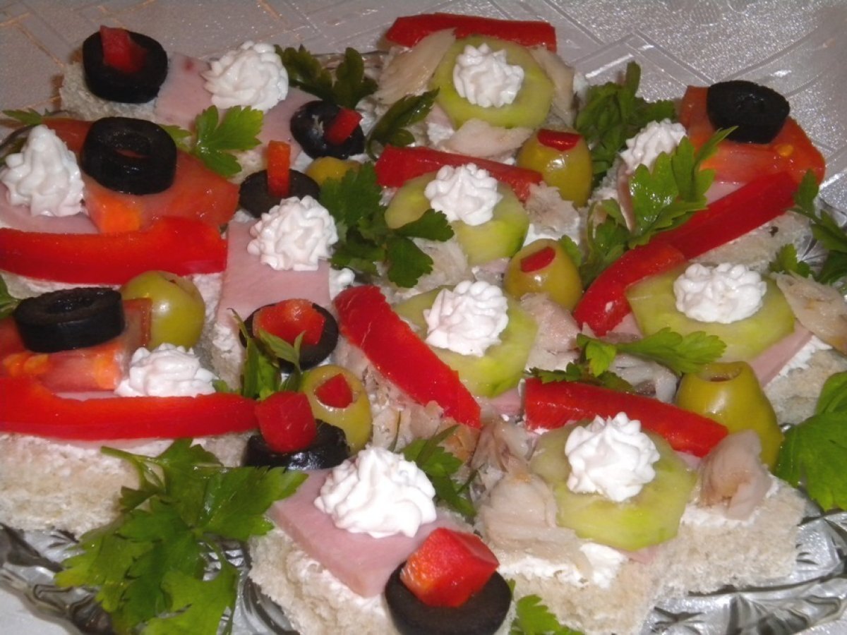 Mini-sandvisuri asortate PrecedentulUrmătorul AntreuriFoarte ușor20 min Trimite unui prieten Printează pagina Adresează o întrebare autorului Postează o poză cu rețeta gătită de tine Ingrediente 4 4 felii mari de paine, 50 g crema de branza, 2 felii de sunca de Praga, cantitati mici de castraveti, salata de icre, rosii, ardei rosu, macrou afumat, masline verzi si frunze de patrunjel pentru decor.