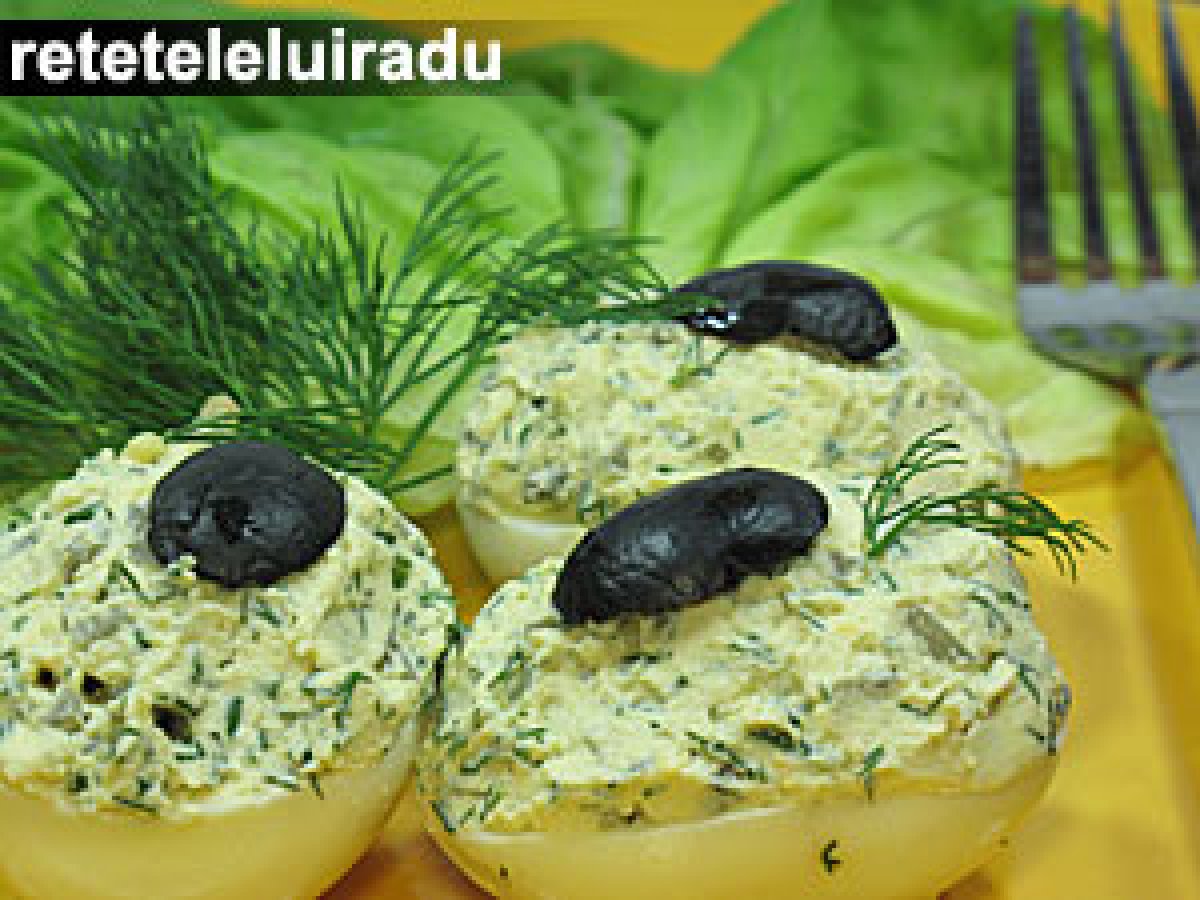 Oua umplute cu castraveciori murati, verdeturi si branza AntreuriFoarte ușor10 min Trimite unui prieten Printează pagina Adresează o întrebare autorului Postează o poză cu rețeta gătită de tine Ingrediente 4 6 oua mari, fierte tari 1 catel mic de usturoi, dat prin razatoare 2-3 castraveciori murati, tocati marunt 4-5 linguri de branza proaspata de vaca 1/2 lingurita de piper alb macinat sare marar proaspat, tocat marunt 6 masline mari, negre, curatate de samburi si taiate in jumatate cateva foi de salata, pentru servit