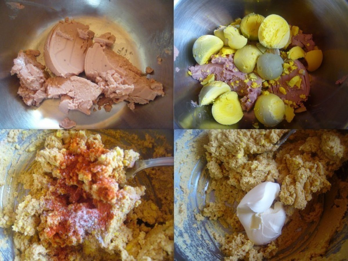 Oua umplute PrecedentulUrmătorul AntreuriFoarte ușor45 min Trimite unui prieten Printează pagina Adresează o întrebare autorului Postează o poză cu rețeta gătită de tine Ingrediente 4 Avem nevoie de: oua fierte, 1 pateu ficat de pui, 1 lingura de unt, sare, piper, boia de ardei, sos maioneza cu smantana