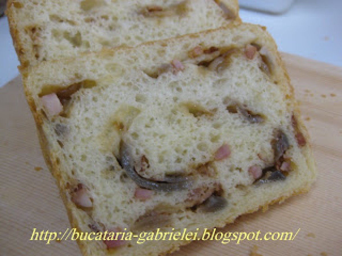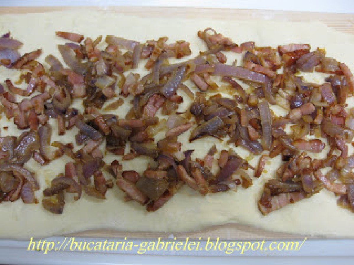 Paine cu ceapa si bacon PrecedentulUrmătorul AntreuriFoarte ușor1 h 15 m Trimite unui prieten Printează pagina Adresează o întrebare autorului Postează o poză cu rețeta gătită de tine Ingrediente 2 250 g faina (190 g faina superioara +6 0g faina inferioara) 5 g drojdie uscata 2 g sare 10 g zahar 145 g apa 30 g ou 5 g skim milk (lapte praf) 12 g unt temperatura camerei Pentru umplut : o lingurita ulei+ 1/2 ceapa + 70g 80 g bacon se calesc putin pana ceapa devine lucioasa