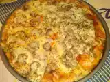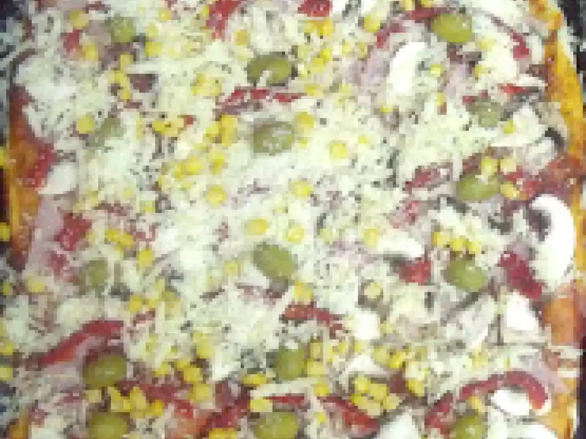 Pizza cu de toate (4-6 persoane) PrecedentulUrmătorul AntreuriFoarte ușor1 oră Trimite unui prieten Printează pagina Adresează o întrebare autorului Postează o poză cu rețeta gătită de tine Ingrediente 6 Pentru aluat: 500 g faina 250 ml apa 10 gr drojdie 1 lingura rasa sare Compozitie: 100 g salam uscat de sibiu 150 g sunca putin afumata 3-4 linguri porumb dulce 6-8 ciuperci champignon 1 rosie mica 1 ardei rosu masline verzi cascaval ras parmezan ras Sos: linguri pasta de tomate 1 rosie decojita tocata 1 lingurita de busuioc uscat 1 lingurita de oregano 2 catei de usturoi tocati 1 fir de ulei de masline