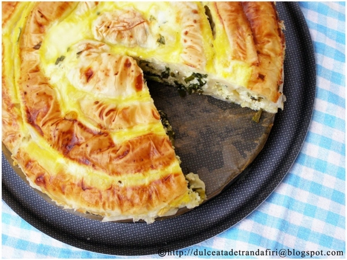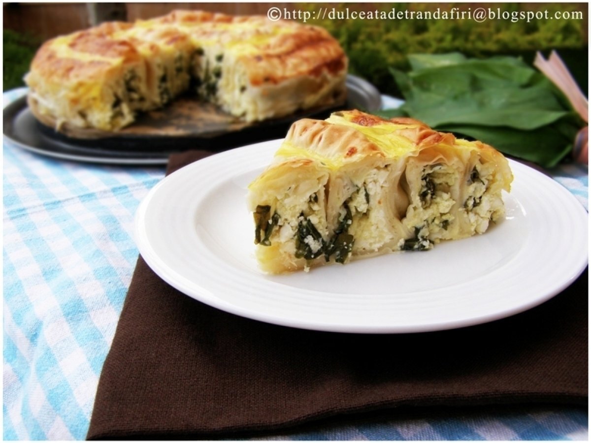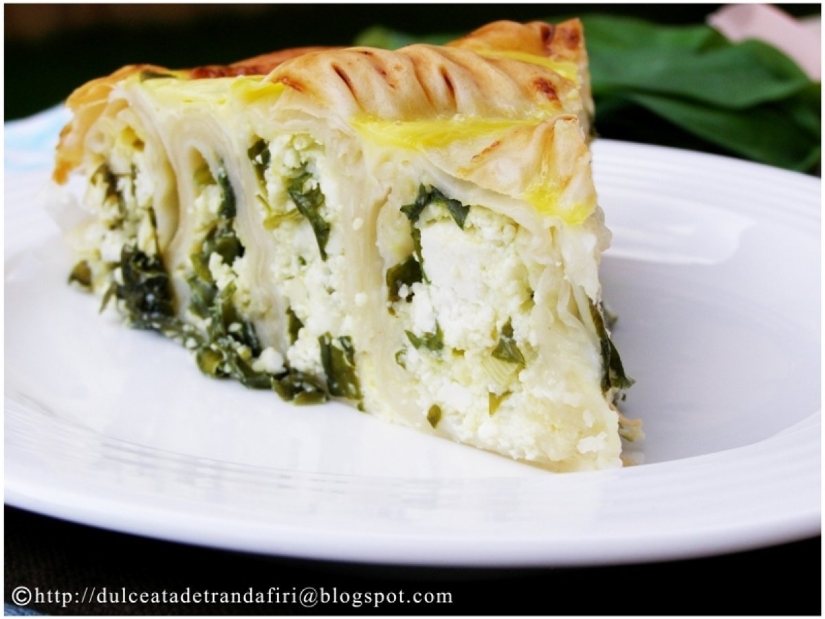 Placinta cu leurda si branza PrecedentulUrmătorul AntreuriUșor50 min Trimite unui prieten Printează pagina Adresează o întrebare autorului Postează o poză cu rețeta gătită de tine Ingrediente 8 Pentru o tava cu peretii detasabili si diametrul de 22/23 cm: 1. 3 legaturi stufoase de leurda 2. 500 gr branza de vaci usor sarata (preferabil tot din piata, de la tarani) 3. 250 gr telemea de bivolita 4. 1 legatura de patrunjel 5. 4 oua 6. o legatura ceapa verde 7. un pachet foi de placinta 8. 200 ml lapte Pentru unsul foilor: 1. 200 gr unt 2. 5 linguri ulei de masline