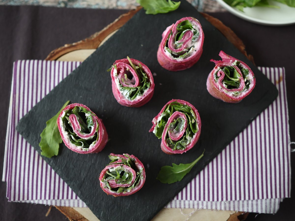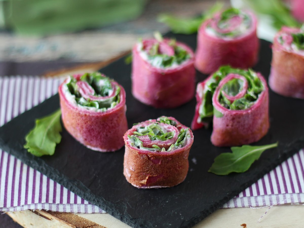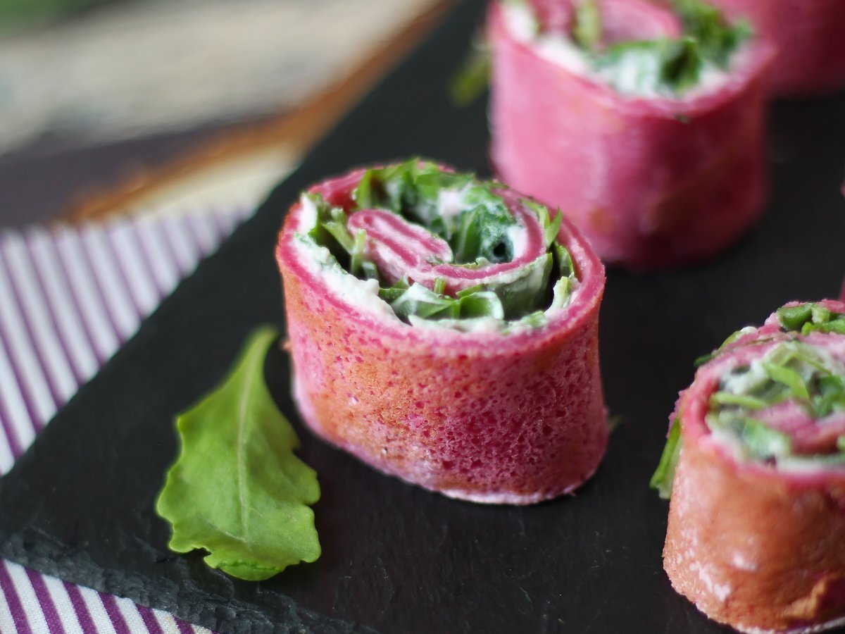 Rulouri de clătite cu sfeclă roșie, umplute cu ricotta și rucola