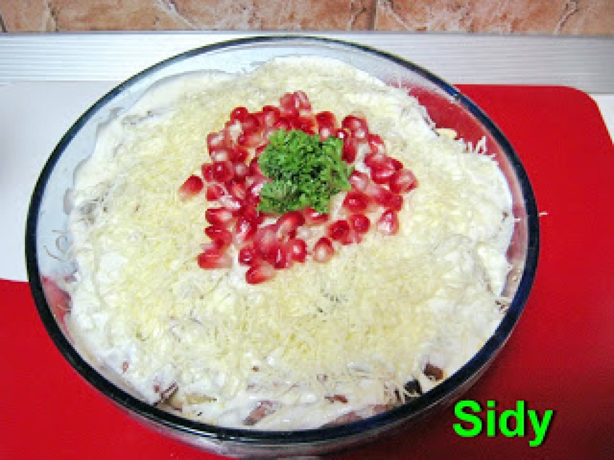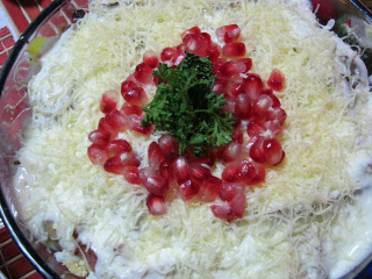 Salata....alternativa votează acum PrecedentulUrmătorul AntreuriFoarte ușor45 min Trimite unui prieten Printează pagina Adresează o întrebare autorului Postează o poză cu rețeta gătită de tine Ingrediente 6 1 salata verde mica 1/2 rodie 1 borcan ciuperci intregi 3 rosii 2 fire ceapa verde 5 oua fierte 150 g cascaval 150 g kaizer patrunjel verde pentru sos: 2 linguri maioneza 200 ml iaurt 1 lingurita mica zahar sare piper
