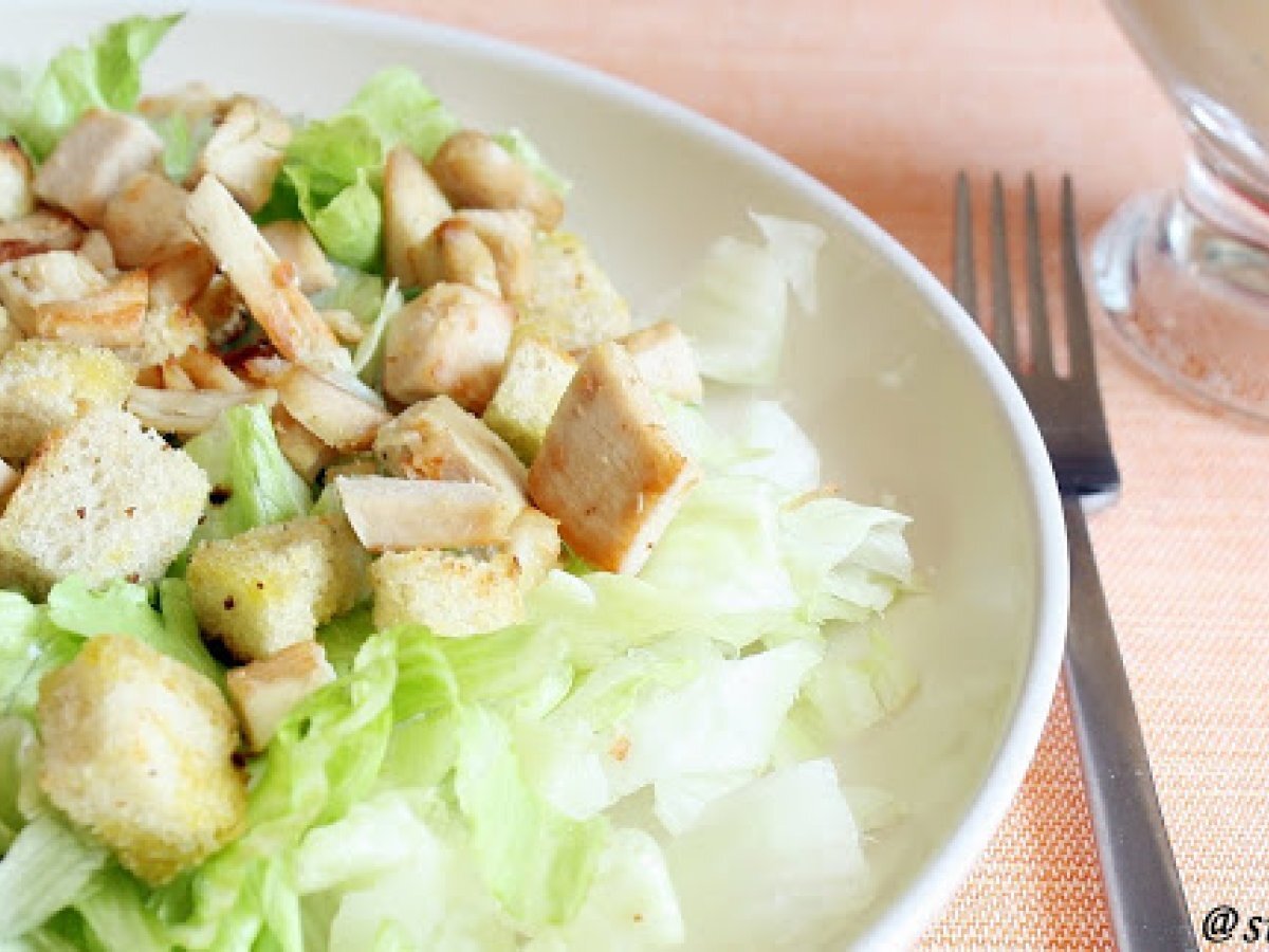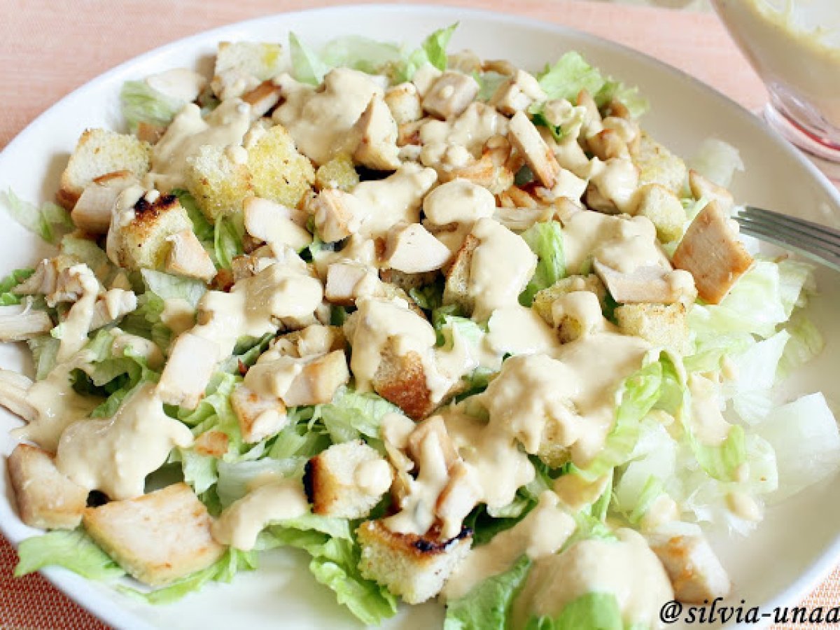 Satioasa si gustoasa, Salata Cezar tine locul unui fel principal. Reteta originala nu continea carne, de niciun fel, ci doar crutoane, salata si dressing. Legat de dressing, sunt iar dispute, in legatura cu faptul ca sosul original continea sau nu ansoa. Dressingul meu contine 2 buc de ansoa, cat sa nu fie gustul prea pregnant, dar totusi sa existe o aroma subtila.