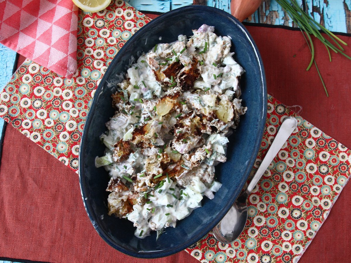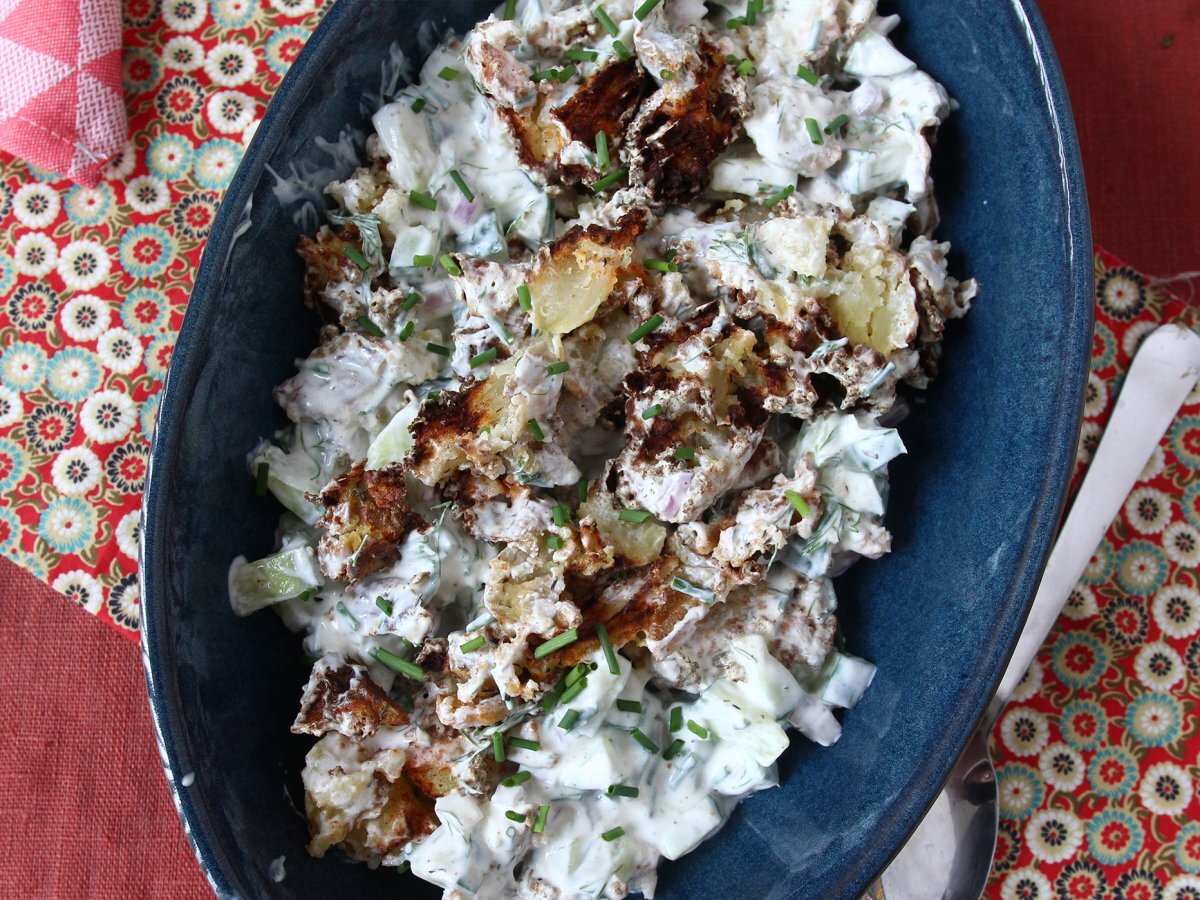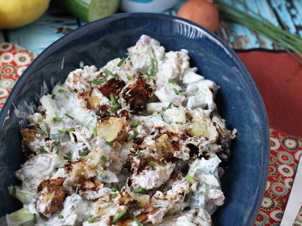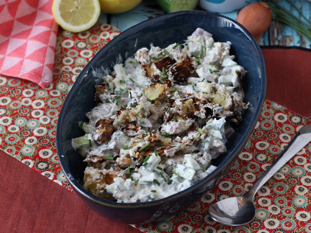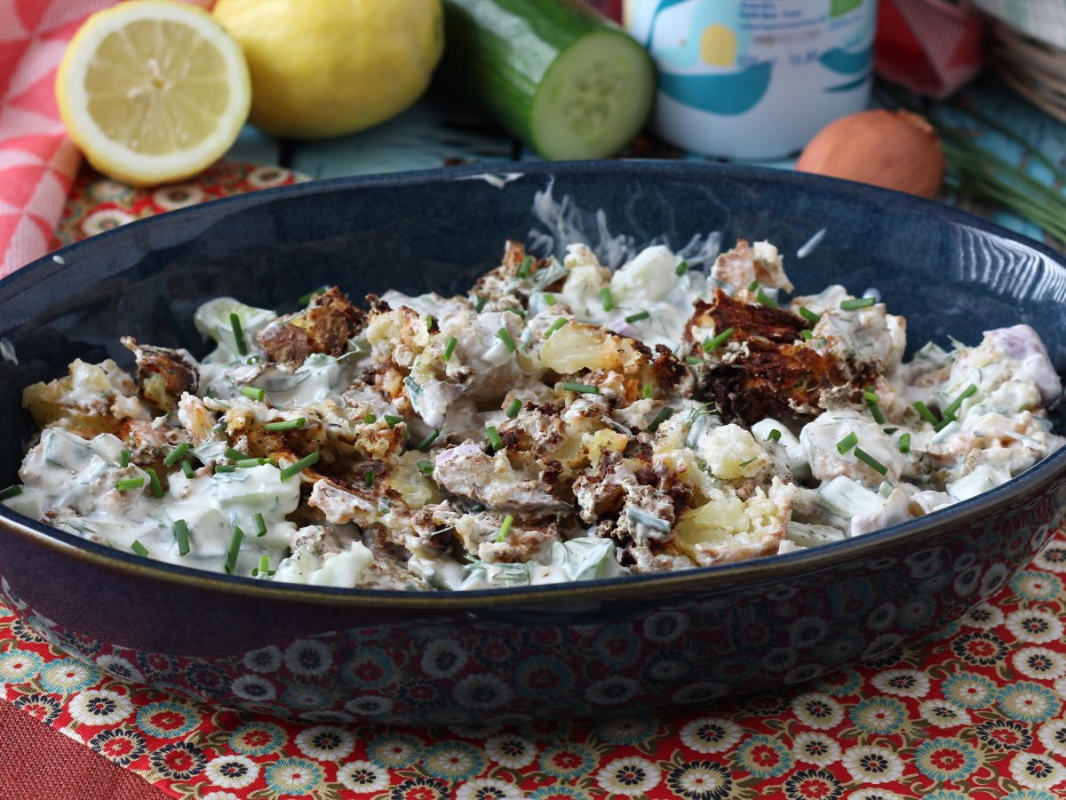 Am găsit una dintre salatele preferate în această vară: salata de castraveți cu cartofii zdrobiți, super crocanți! Foarte ușor de preparat, această salată combină castraveții proaspeți și cartofi aurii și crocanți stilul „cartofi zdrobiți”, creând un echilibru delicios de texturi și mai presus de toate un contrast cald-absolut rece, ce creează dependență. Va fi ideală pentru a vă însoți felurile principale, pentru un aperitiv original sau chiar ca acompaniament pentru un grătar! ;-)