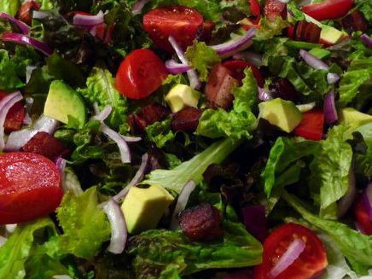 Salata cu avocado si bacon AntreuriFoarte ușor20 min Trimite unui prieten Printează pagina Adresează o întrebare autorului Postează o poză cu rețeta gătită de tine Ingrediente 2 8 bucati de bacon prajite si apoi scurse de ulei pe un servetel de hartie 2 linguri de capere 1/2 ceapa rosie taiata rondele subtiri 2 maini de varza chinezeasca taiata marunt si spalata(asha ii spun ei la Cora la Romain lettuce) 2 avocado curatate si taiate felii subtiri 2 rosii taiate felii subtiri Dressing-ul Vinaigrette 2 linguri ulei de masline 2 linguri de otet de mere sucul de la o jumatate de lamaie 2 linguri de mustar iute Dijon 2 catei de usturoi zdrobiti sare si piper