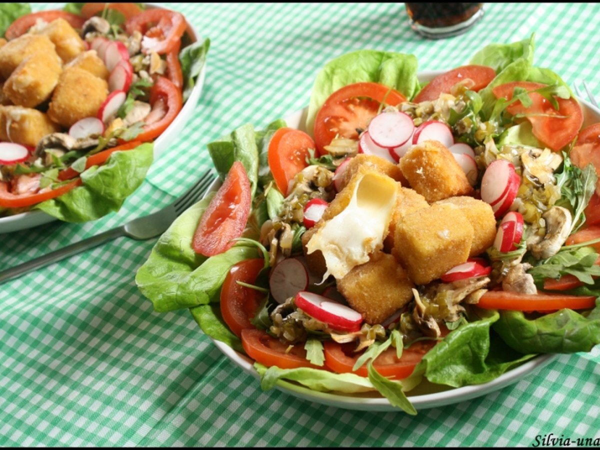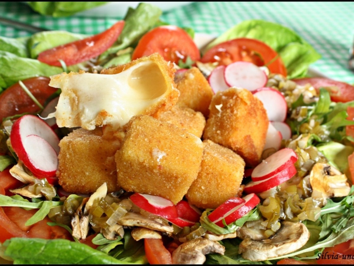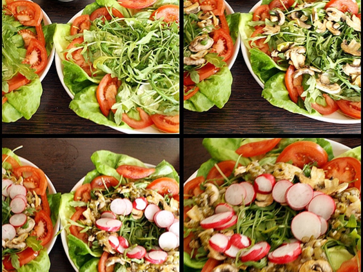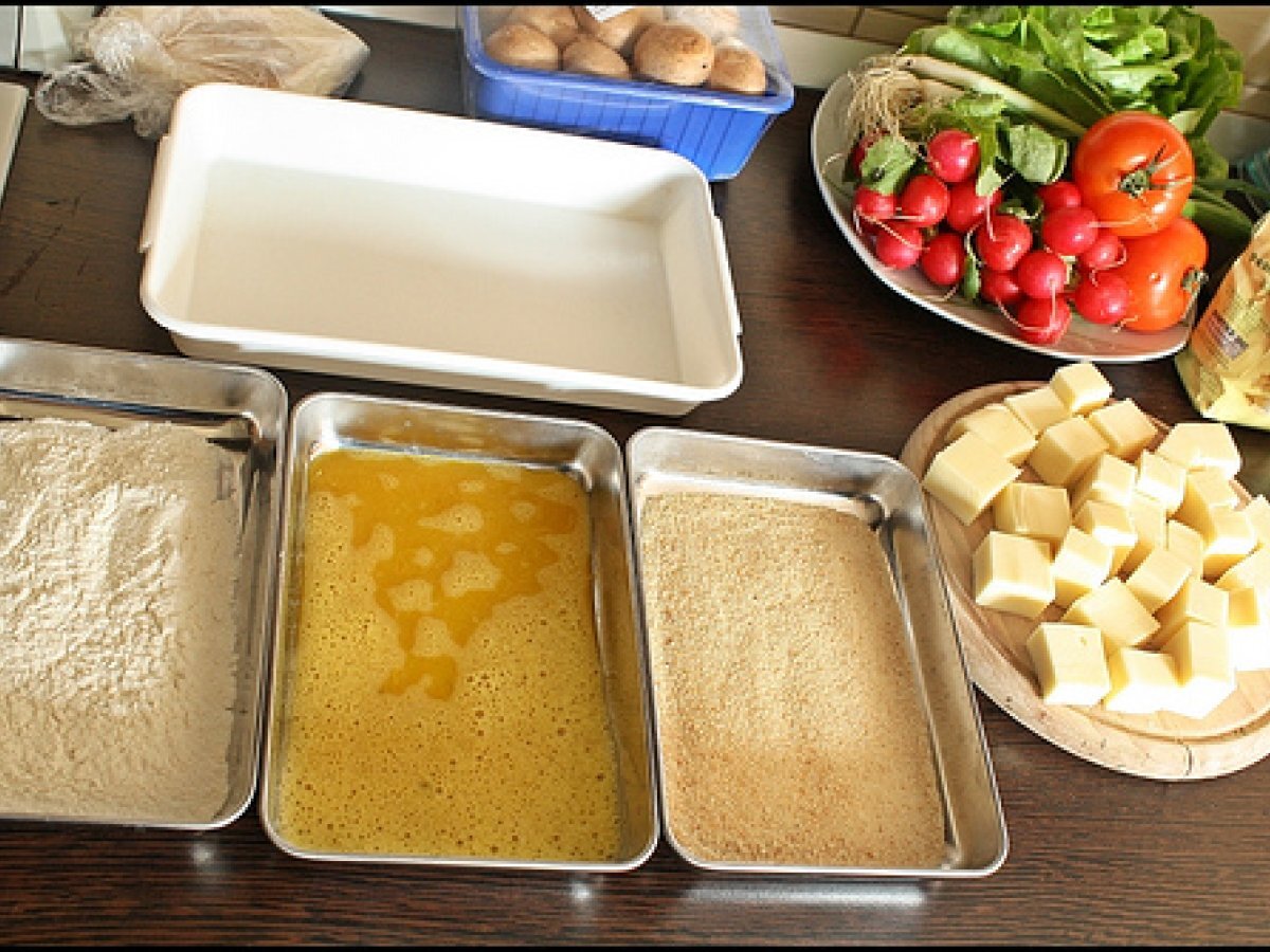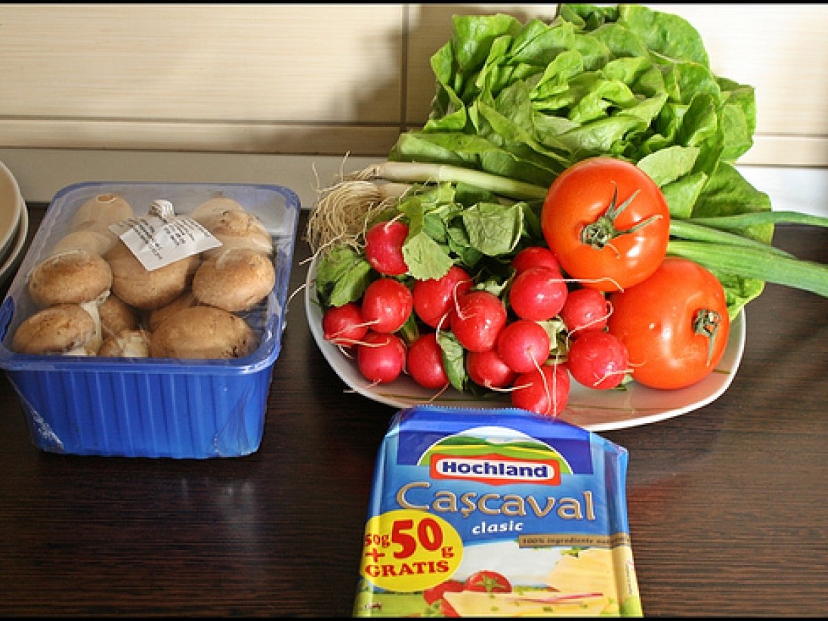 Salata cu cascaval pane si carpaccio de ciuperci PrecedentulUrmătorul AntreuriFoarte ușor40 min Trimite unui prieten Printează pagina Adresează o întrebare autorului Postează o poză cu rețeta gătită de tine Ingrediente 4 Pentru cascaval pane: 230 g cascaval 2 oua pesmet faina alba sare ulei pentru prajit. Pentru carpaccio de ciuperci: 4-5 ciuperci champignon 1 ceapa mica uscata, 1 catel usturoi, 1 lingurita busuioc sau cimbru, sare, zahar, otet - de mere am folosit, ulei. Legume: salata verde, rucola rosii ceapa verde- pentru ornat, ridichi.