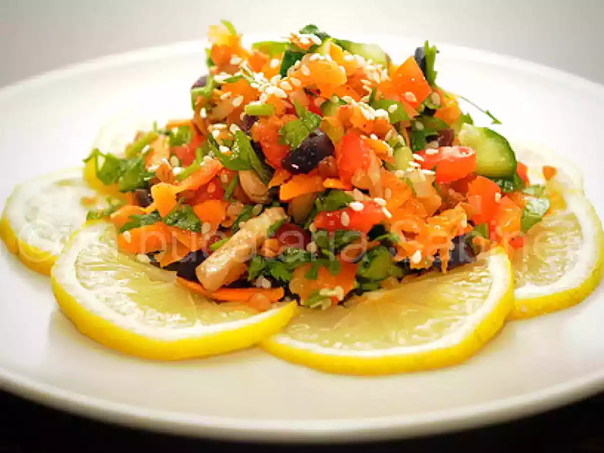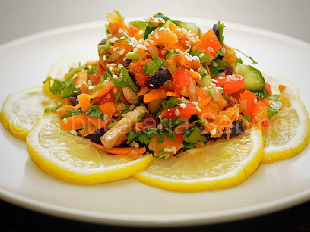 Salata cu hrisca si susan AntreuriFoarte ușor25 min Trimite unui prieten Printează pagina Adresează o întrebare autorului Postează o poză cu rețeta gătită de tine Ingrediente 4 50-60 grame hrisca 2 linguri seminte susan 1 morcov 2 rosii coapte 2 castraveti mici 1 ceapa 1 ardei gras rosu 2 ciuperci crude 10 masline Kalamata 1/2 lamaie 1 lingura ulei de masline 1 legatura de patrunjel sare si piper