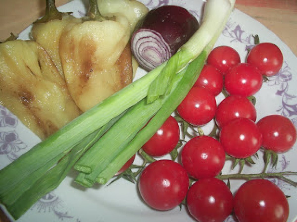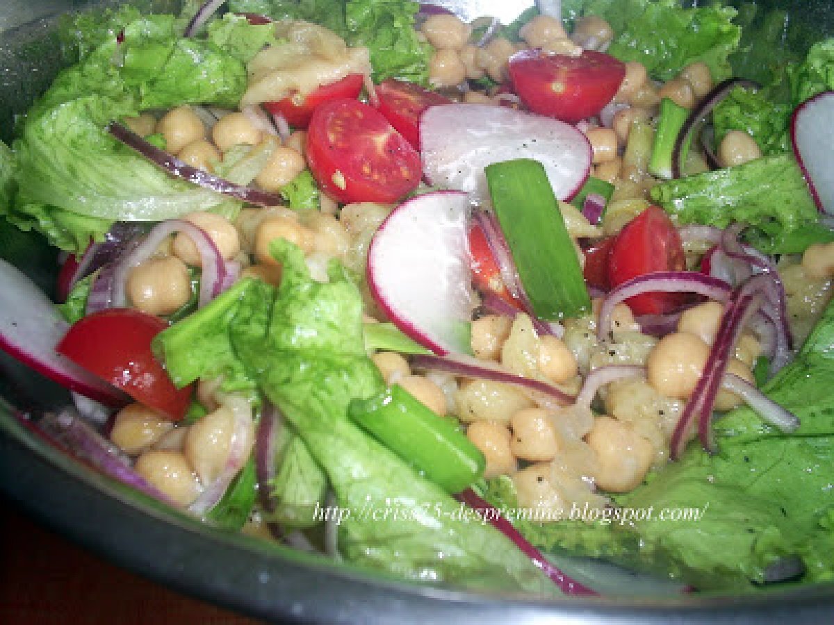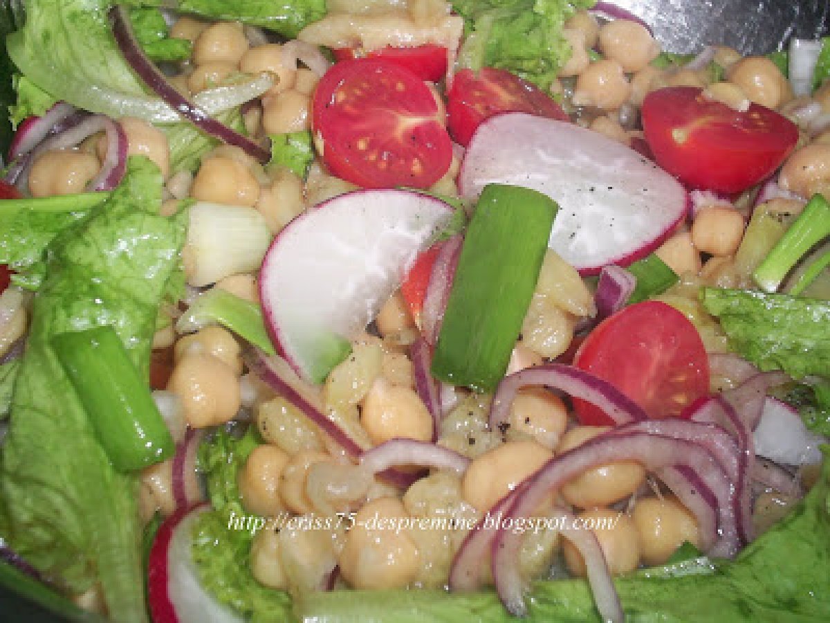 Salata cu naut si ardei copti PrecedentulUrmătorul AntreuriFoarte ușor40 min Trimite unui prieten Printează pagina Adresează o întrebare autorului Postează o poză cu rețeta gătită de tine Ingrediente 4 200 g naut fiert in apa cu sare 1 ceapa rosie 2 fire ceapa verde 4 ardei copti (am avut in congelator) cateva frunze de salata verde 1 ridiche rosii cherry dressing din ulei de masline, otet, sare, piper