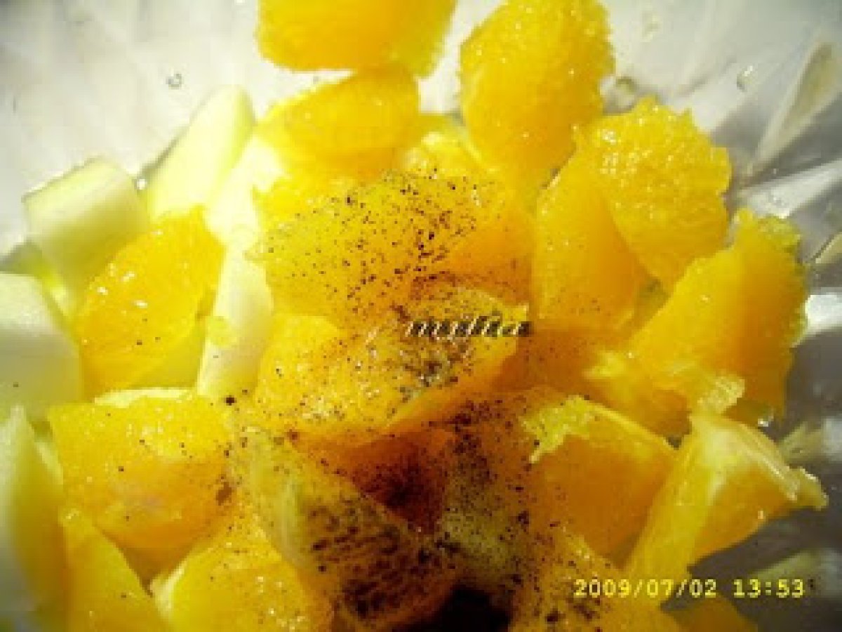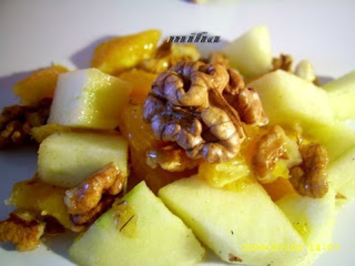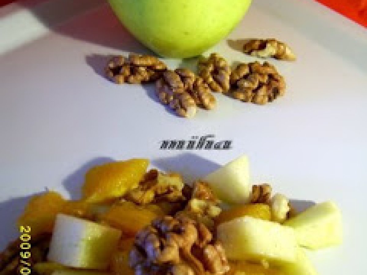 Salata cu nuca,mar si portocala votează acum PrecedentulUrmătorul AntreuriFoarte ușor30 min Trimite unui prieten Printează pagina Adresează o întrebare autorului Postează o poză cu rețeta gătită de tine Ingrediente 2 2 linguri otet din vin rosu 2 linguri suc de portocale 1 portocala 1/2 cana stafide 4 mere (2-3 soiuri diferite) 2/3 cana cu nuca, prajita si taiata bucati mari 2 linguri ulei de masline extra-virgin sare, piper