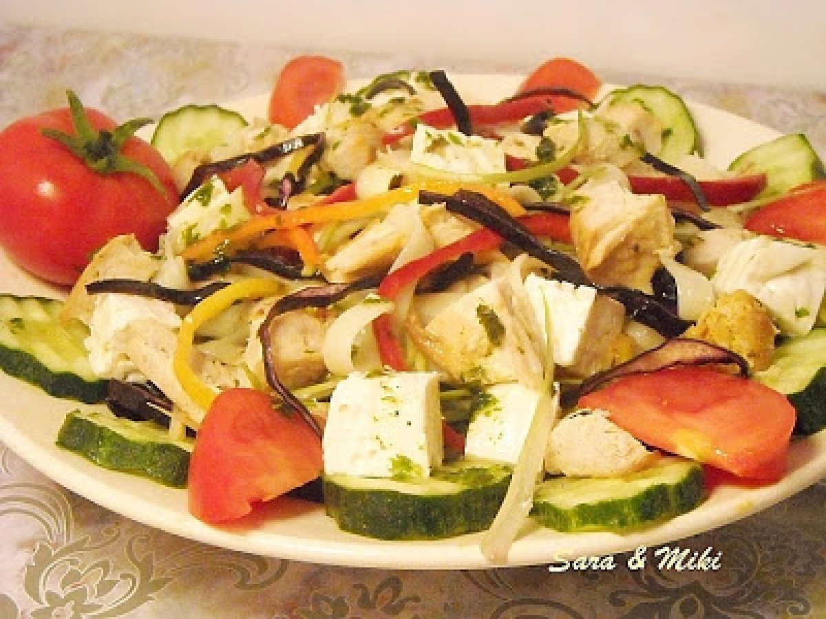 Salata cu paste, pui si branza PrecedentulUrmătorul AntreuriFoarte ușor30 min Trimite unui prieten Printează pagina Adresează o întrebare autorului Postează o poză cu rețeta gătită de tine Ingrediente 6 200 g paste 1 piept de pui 100 g telemea, ardei rosu si galben 2 frunze de varza rosie 2-3 fire ceapa verde 1 castravete 3 rosii sos vinegrete sare piper