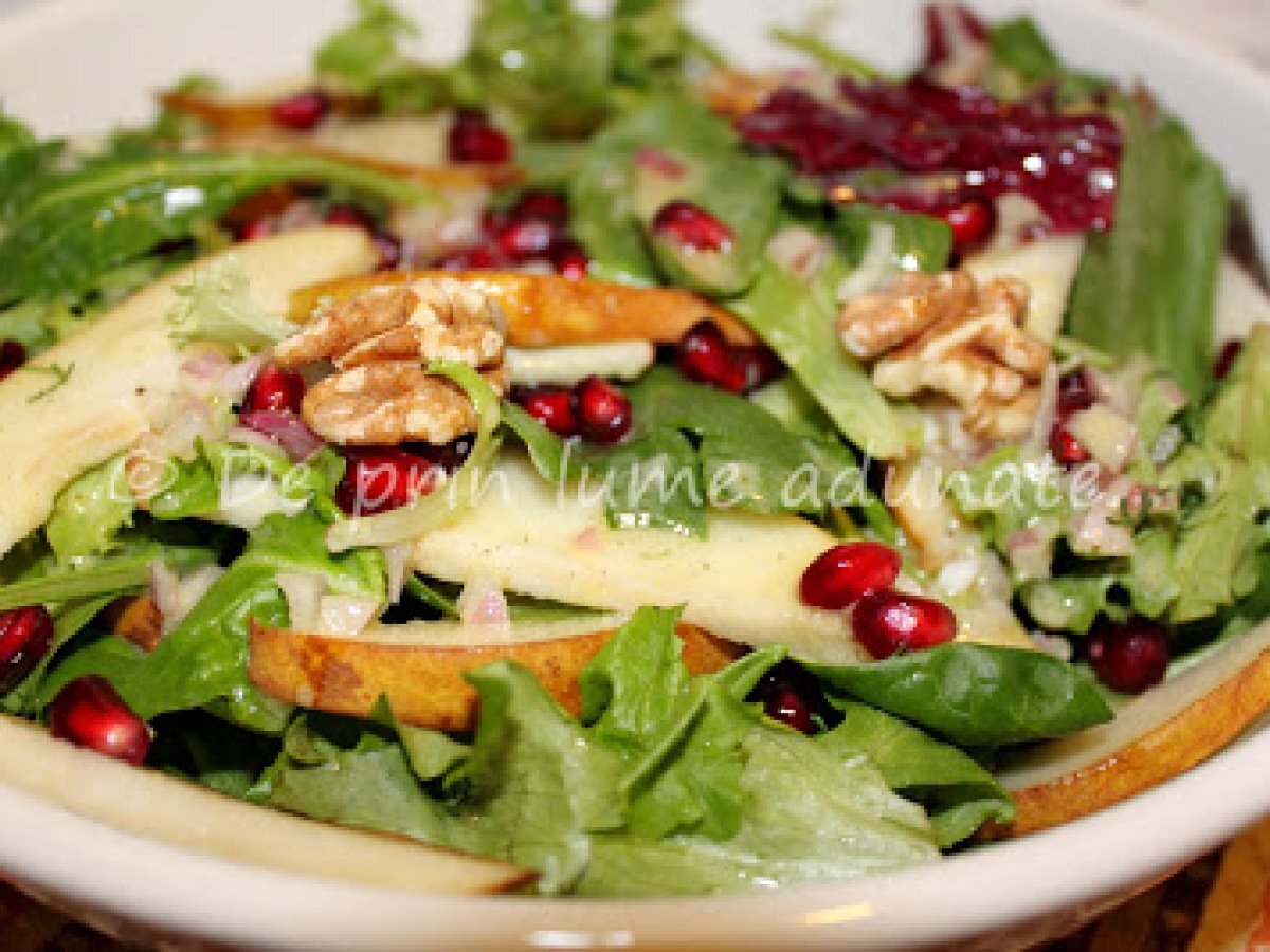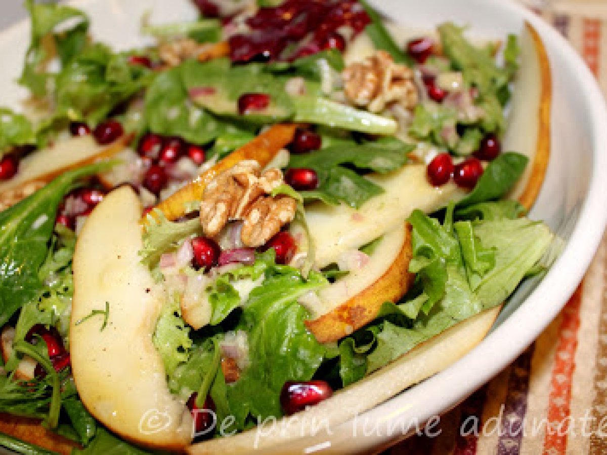 Salata cu pere si rodii PrecedentulUrmătorul AntreuriFoarte ușor10 min Trimite unui prieten Printează pagina Adresează o întrebare autorului Postează o poză cu rețeta gătită de tine Ingrediente 4 2-3 maini de verdeturi amestecate 1 para fara cotor, feliata subtire 2-3 linguri seminte de rodie 1/2 cana nuci coapte* Pentru dressing: 1 shalot tocat 2 lingurite mustar 1 lingura de vin Sherry 2 linguri otet de mere 1/2 lingurita sare si piper proaspat macinat dupa gust 100 ml ulei de masline extra virgin