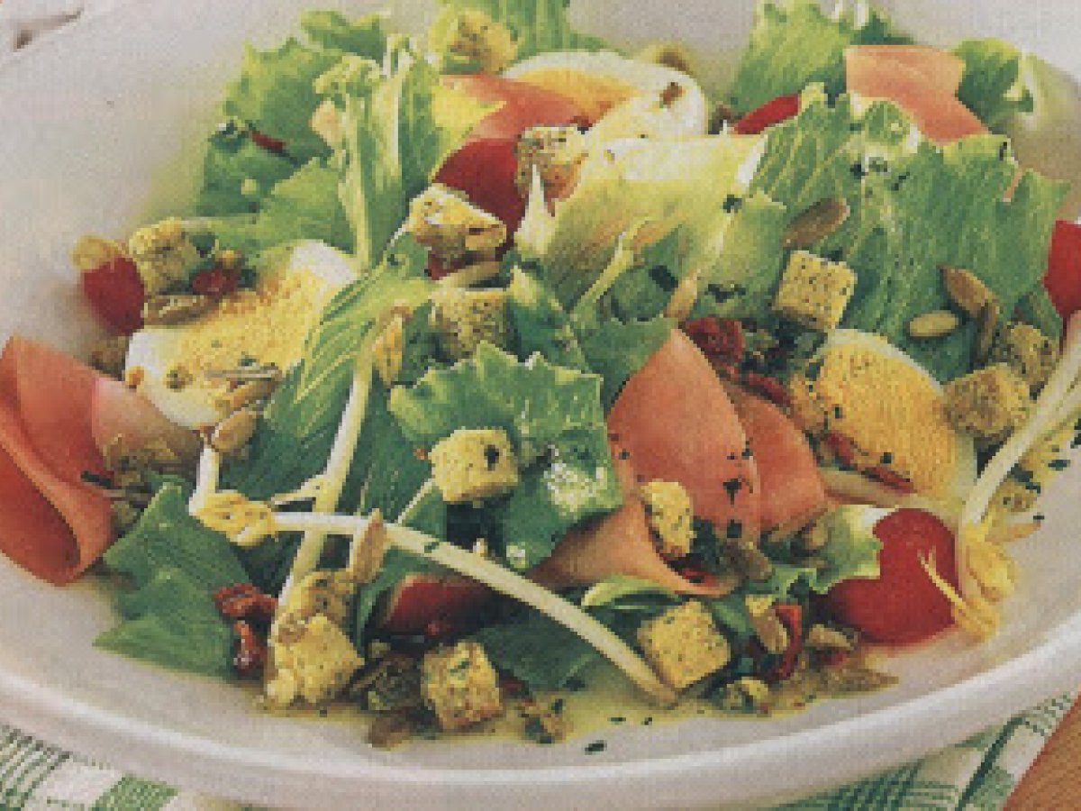 Salata cu piept de curcan votează acum AntreuriFoarte ușor30 min Trimite unui prieten Printează pagina Adresează o întrebare autorului Postează o poză cu rețeta gătită de tine Ingrediente 4 1 salata eisberg 1/2 legatura ridichi 50 g germeni de soia proaspeti 2 linguri verdeata tocata 5 linguri suc de portocale 5 linguri ulei 2 oua fierte tari 120 g piept de curcan afumat feliat 200 g crutoane