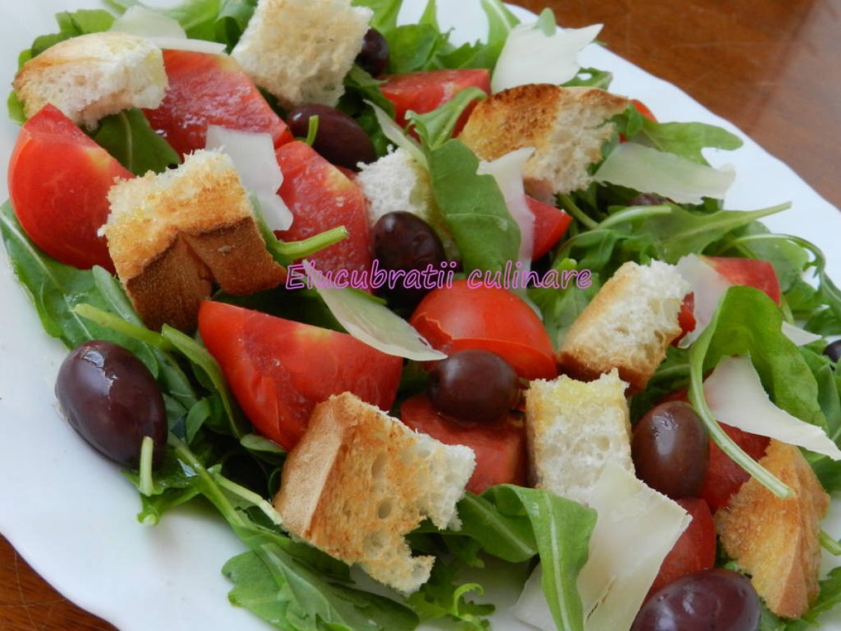 Salată cu rucola AntreuriFoarte ușor10 min Trimite unui prieten Printează pagina Adresează o întrebare autorului Postează o poză cu rețeta gătită de tine foarte usoară și sana Ingrediente 2 75 g frunze de rucola, 4-5 roșii mici, 75 g măsline Kalamata, 2 felii de pâine prăjită, parmezan, 2 linguri ulei de măsline, 1 lingură zeamă de lămâie, sare.