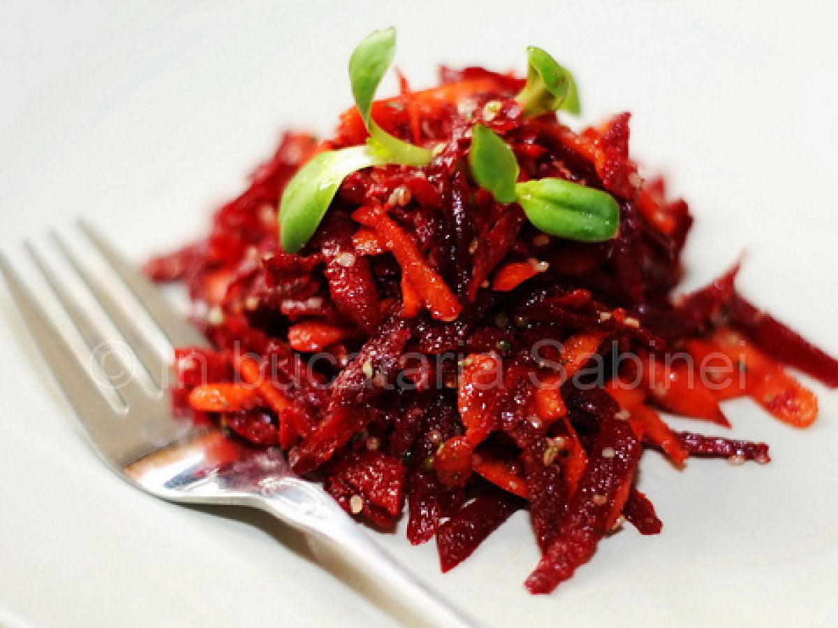Salata cu sfecla rosie AntreuriFoarte ușor20 min Trimite unui prieten Printează pagina Adresează o întrebare autorului Postează o poză cu rețeta gătită de tine Ingrediente 4 o sfecla rosie potrivita 1 morcov 2 linguri ulei de masline/de in zeama de la 1/2 lamaie 3 lingurite seminte un praf de chimen optional - cativa vlastari de floarea soarelui sare si piper