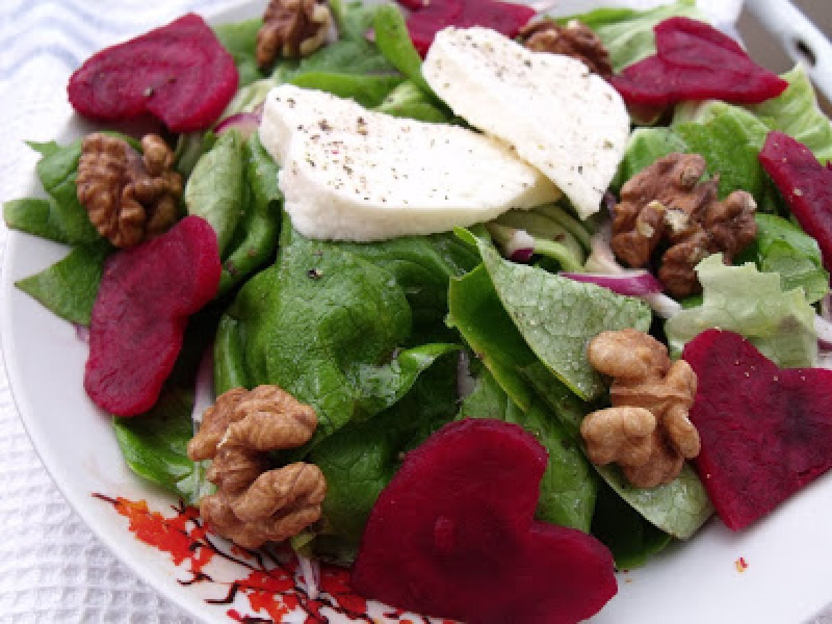 Salata cu sfecla rosie si mozzarella(beet and mozzarella salad) PrecedentulUrmătorul AntreuriFoarte ușor30 min Trimite unui prieten Printează pagina Adresează o întrebare autorului Postează o poză cu rețeta gătită de tine Ingrediente 2 1 sfecla rosie coapta sau facuta la abur taiata in felii si apoi in forme de inimioare 1 salata verde rupta bucati cu mina 1 mina de miezi de nuca gratinati 1 ceapa rosie taiata julien 1 bulgaras de mozzarella feliat si taiat tot in inimioare 2 linguri ulei de masline 1 lingura de otet sare piper