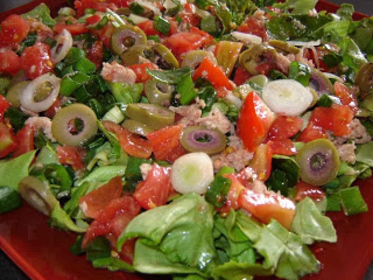 Salata cu ton 2 / tuna salad 2 PrecedentulUrmătorul AntreuriFoarte ușor30 min Trimite unui prieten Printează pagina Adresează o întrebare autorului Postează o poză cu rețeta gătită de tine Ingrediente 2 1/2 salata verde 1 conserva de ton 3 fire ceapa verde 3 rosii 1 mana masline verzi sare zeama de lamaie