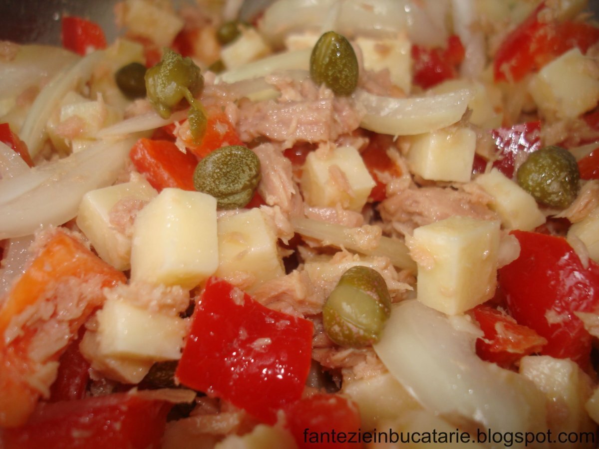 Salata cu ton AntreuriFoarte ușor15 min Trimite unui prieten Printează pagina Adresează o întrebare autorului Postează o poză cu rețeta gătită de tine Ingrediente 2 160 gr.ton in suc propriu 150 grame cascaval 1 ceapa mare alba 1 ardei rosu o lamaie 10 masline sau 20 capere 2 linguri ulei /maioneza sare si piper negru dupa gust