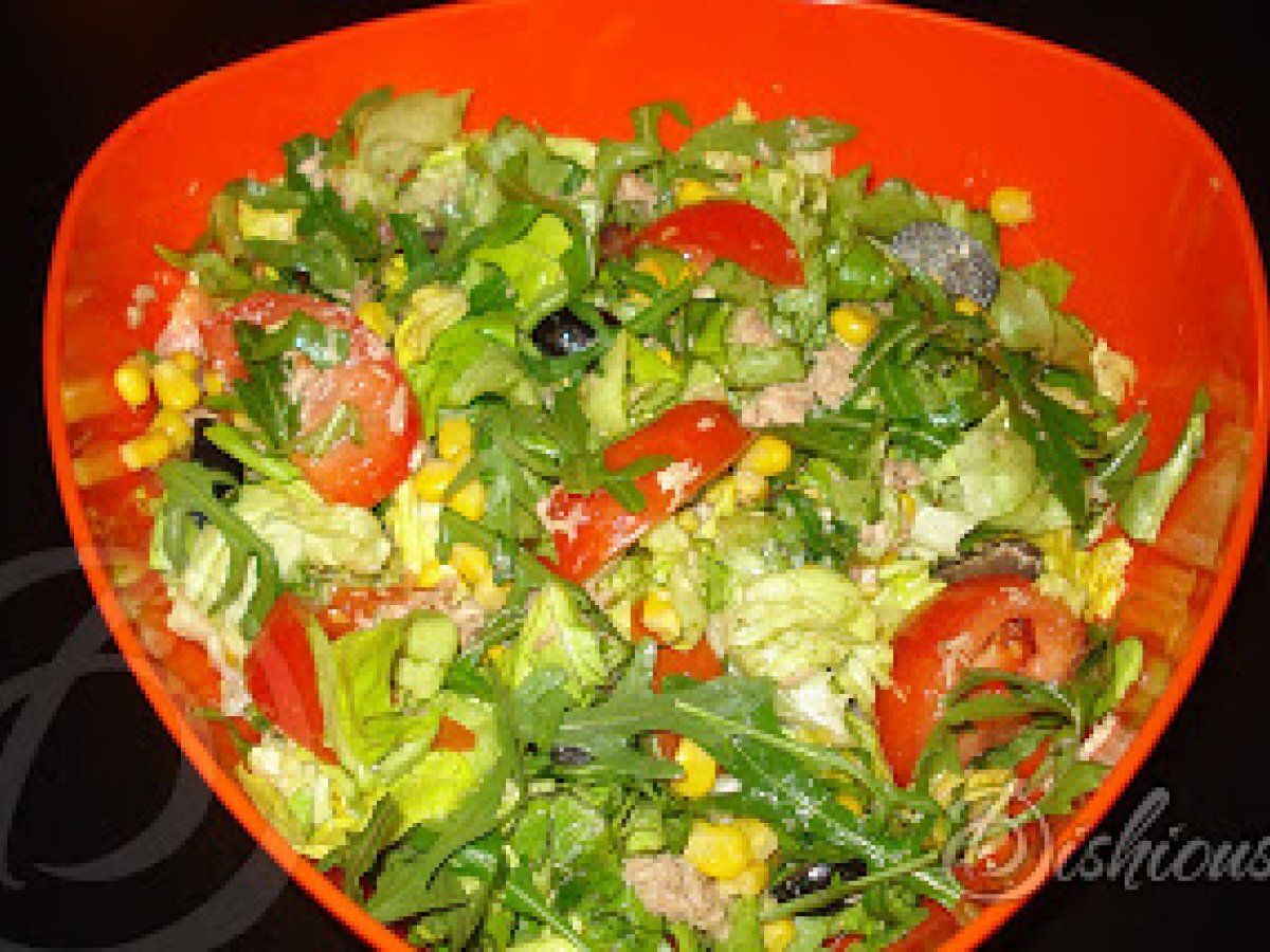 Salata cu ton, rucola si porumb AntreuriFoarte ușor35 min Trimite unui prieten Printează pagina Adresează o întrebare autorului Postează o poză cu rețeta gătită de tine Ingrediente 4 o salata potrivita 50 g frunze rucola o conserva de ton maruntit in - ulei sau in suc propriu 1/2 de conserva de porumb 2 rosii 50 g masline fara samburiulei de masline - extravirginsucul de la 1/2 lamaie