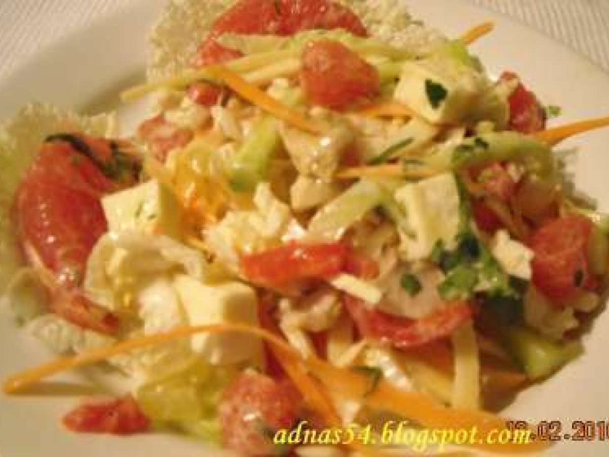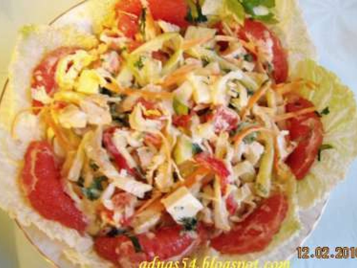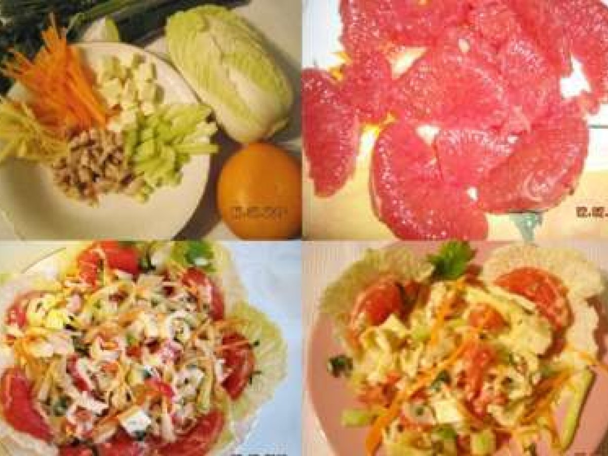 Salata cu varza de china PrecedentulUrmătorul AntreuriFoarte ușor20 min Trimite unui prieten Printează pagina Adresează o întrebare autorului Postează o poză cu rețeta gătită de tine Ingrediente 4 1 Varza de China, mica 1/2 piept de pui fiert 100 grcascaval 150 gr. branza 1 grepefruit 1 ardei rosu 1 ceapa rosie mica 1 morcov 1/2 castravete coriandru Sos vinaigrette: 80 ml.ulei de masline 10 ml. otet 1 lingurita de mustar sare, piper, zahar dupa gust