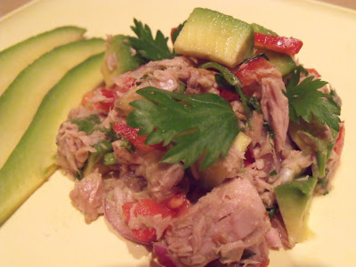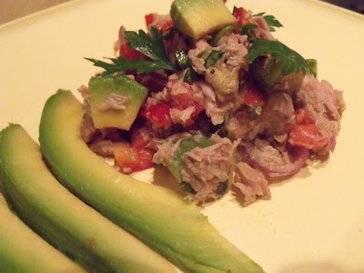 Salata de avocado cu ton(avocado&tuna salad) PrecedentulUrmătorul AntreuriFoarte ușor30 min Trimite unui prieten Printează pagina Adresează o întrebare autorului Postează o poză cu rețeta gătită de tine Ingrediente 4 1 avocado,taiat cuburi, 2 conserve mici cu bucati de ton in apa,scurse, 1 ardei kapia,taiat fideluta, 1 rosie ,taiata cuburi mari, 1 ceapa rosie,mica,taiata rondele, 1 manunchi mic de frunze de patrunjel verde,tocate marunt, 1 lamiie,la care ii colectam sucul,dupa stoarcere, sare ,piper proaspat macinat.
