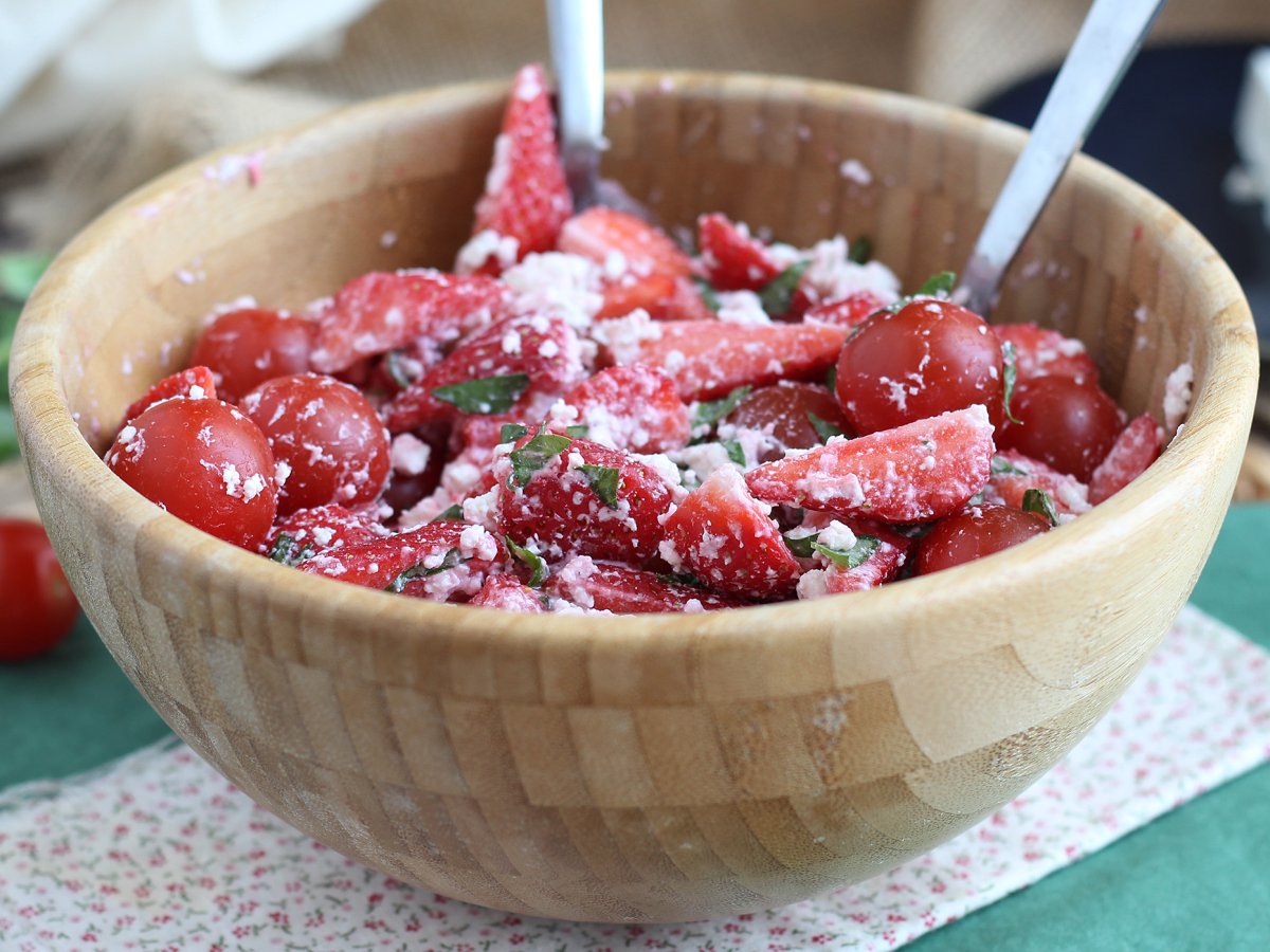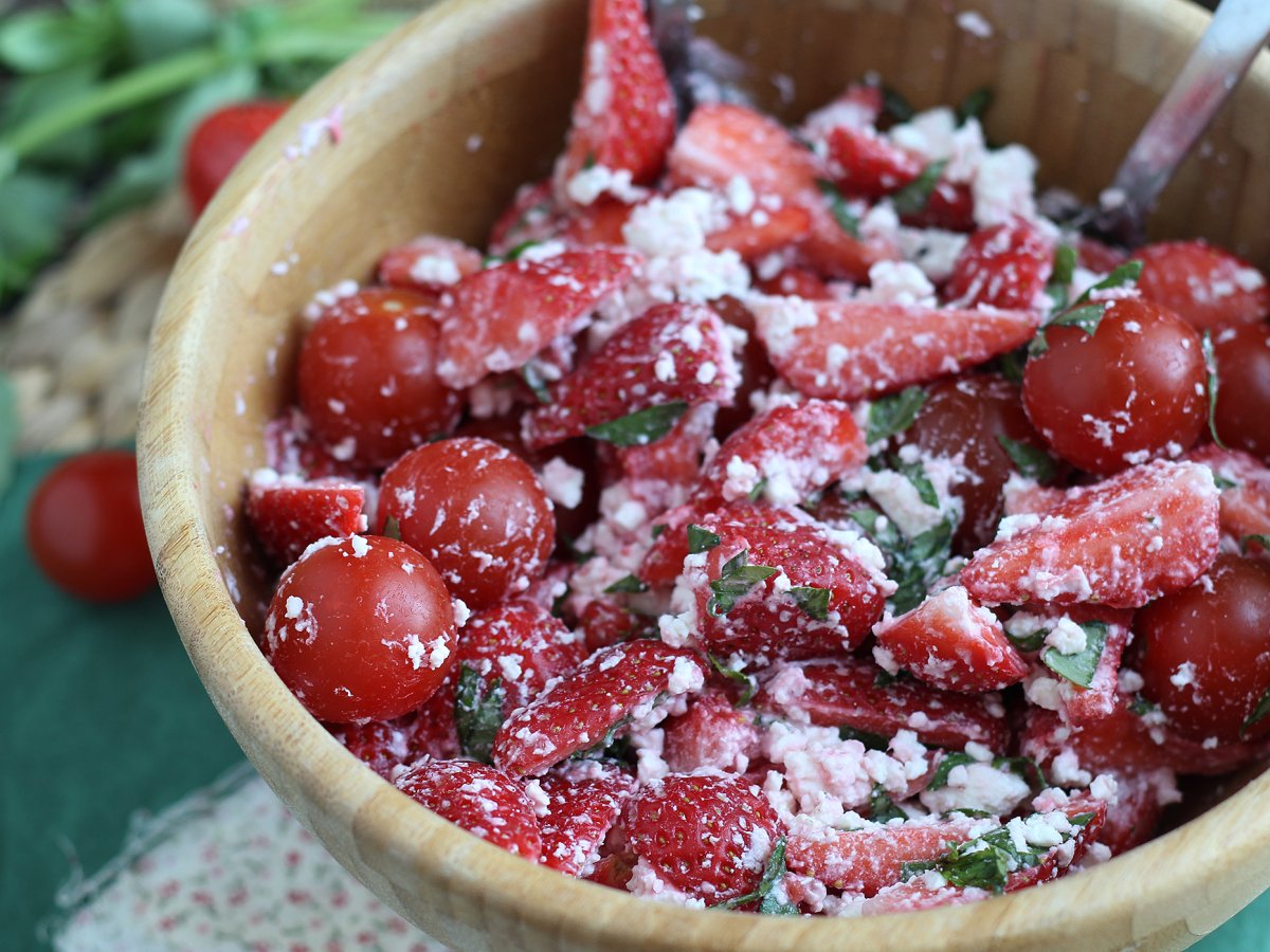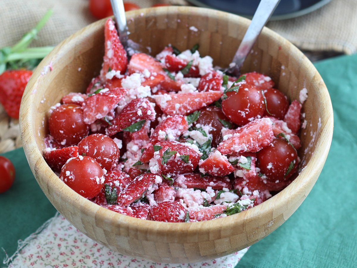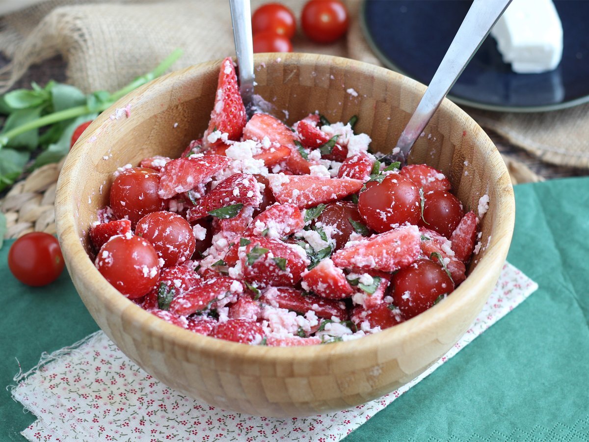 De ce nu vă lăsați tentați de o salată savuroasă de căpșune?! Combinată cu roșii cherry, brânză feta și frunze de busuioc, vă putem asigura că această rețetă va mirosi bine vara și în zilele ei însorite. O plăcere să o mănânci proaspătă ;-)