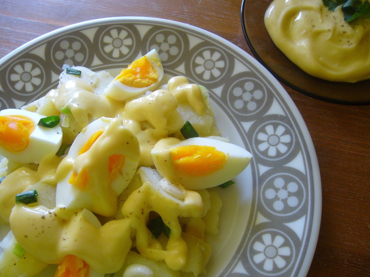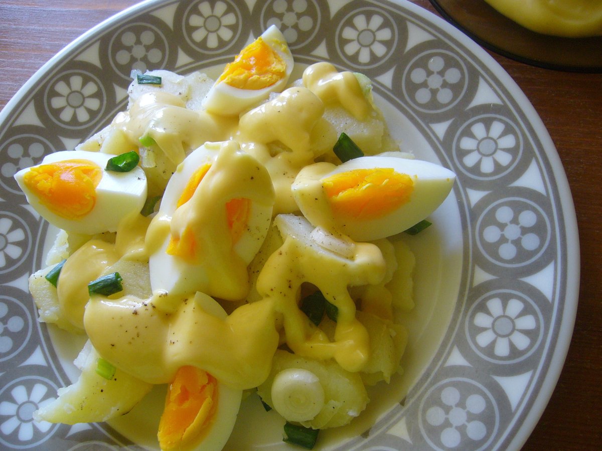 Salata de cartof cu, sos maioneza cu smantana PrecedentulUrmătorul AntreuriFoarte ușor50 min Trimite unui prieten Printează pagina Adresează o întrebare autorului Postează o poză cu rețeta gătită de tine Ingrediente 4 1/2 kg cartofi fierti, 2-3 fire ceapa verde, 3 oua fierti, sare, piper, sos maioneza cu smantana, 1-2 lg ulei de masline.