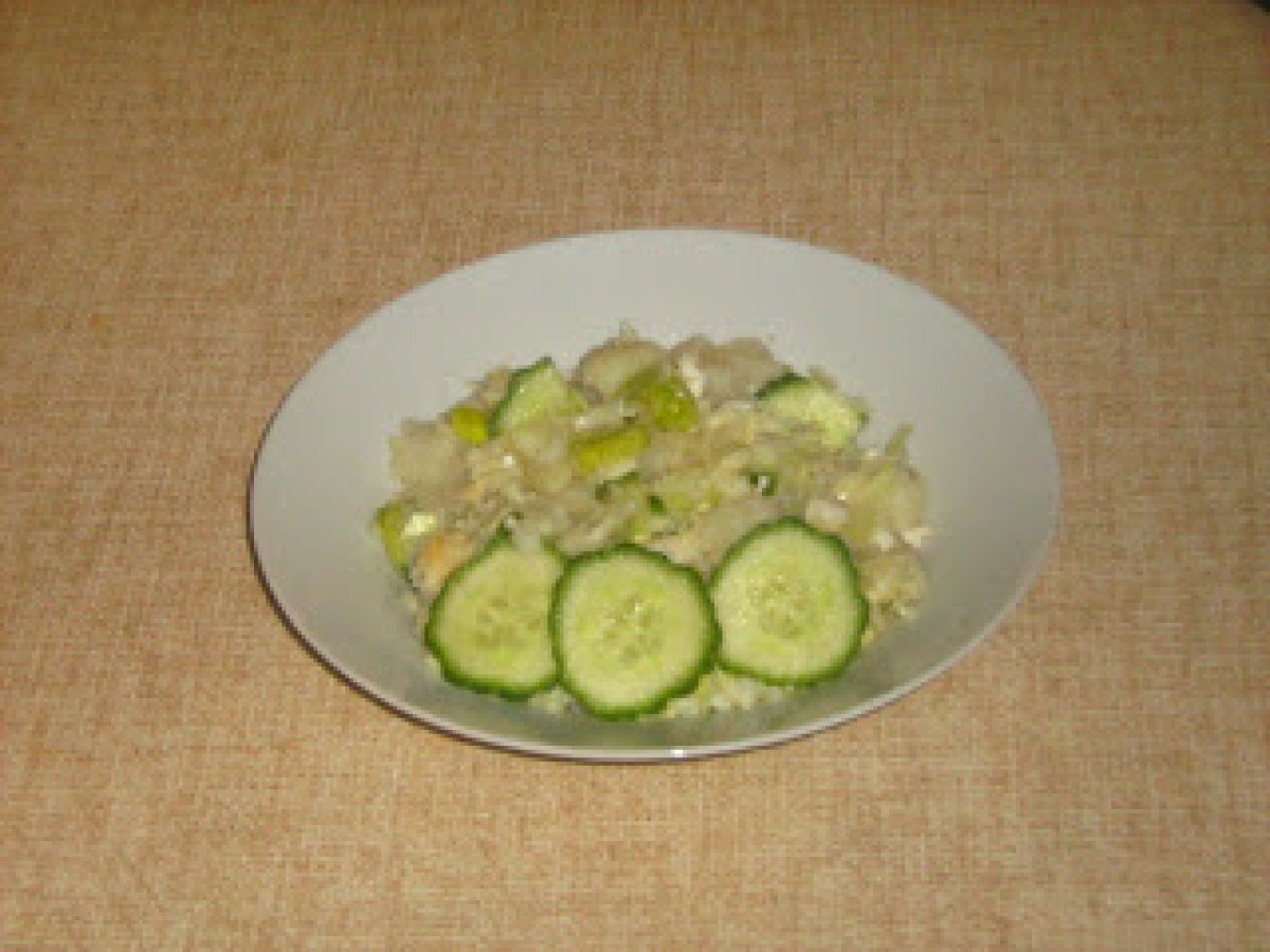 Salata de cartofi cu oua,praz si castraveti AntreuriFoarte ușor40 min Trimite unui prieten Printează pagina Adresează o întrebare autorului Postează o poză cu rețeta gătită de tine Ingrediente 4 8 cartofi potriviti 2 oua 1 praz 1/2 castravete taiat cubulete,daca se doreste decor,se taie cateva rondele sare piper otet 8 linguri ulei de masline
