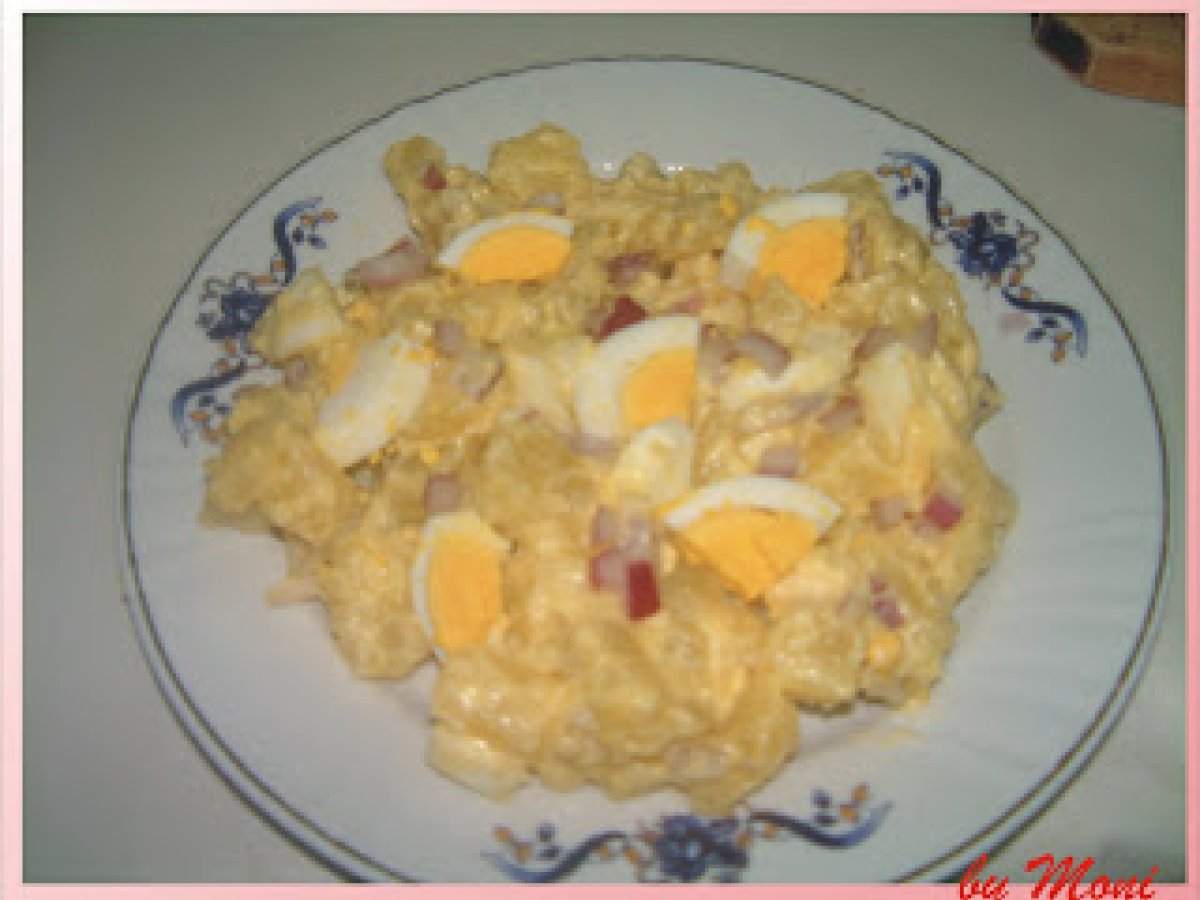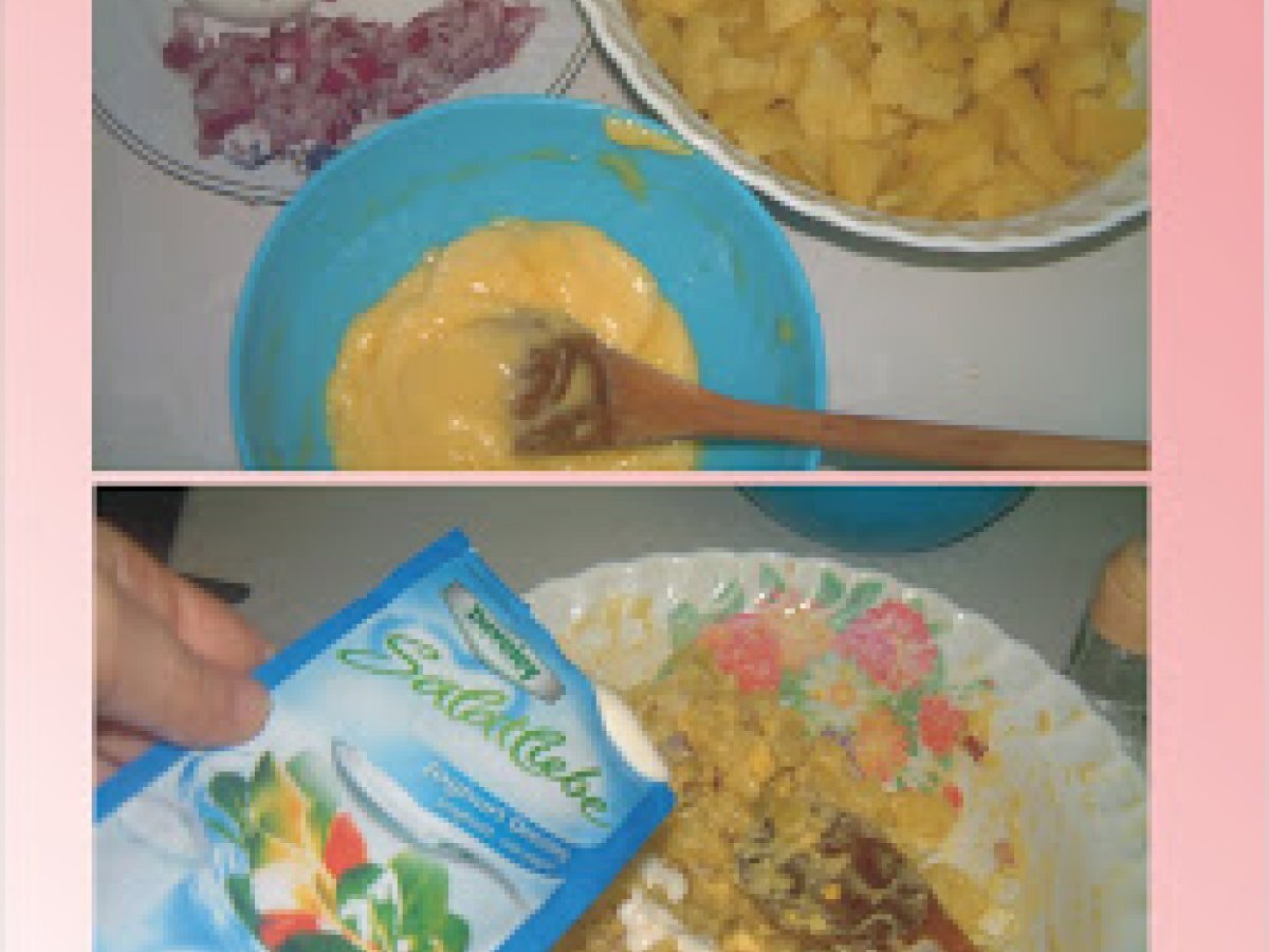 Salata de cartofi cu oua si iaurt PrecedentulUrmătorul AntreuriFoarte ușor30 min Trimite unui prieten Printează pagina Adresează o întrebare autorului Postează o poză cu rețeta gătită de tine Ingrediente 4 vreo 5-6 cartofi mai maricei, 3 oua fierte, ceapa rosie dupa gustul fiecaruia, maioneza, sare, piper, iaurt cu ierburi aromate.