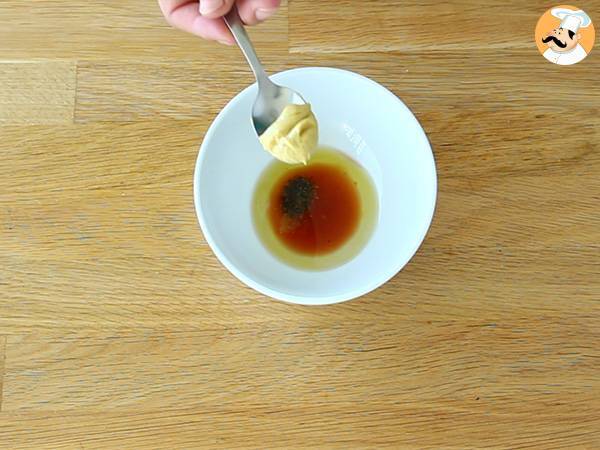 Dressingul: Se amesteca uleiul de masline, uleiul de nuci, otetul, sarea, piperul si mustarul