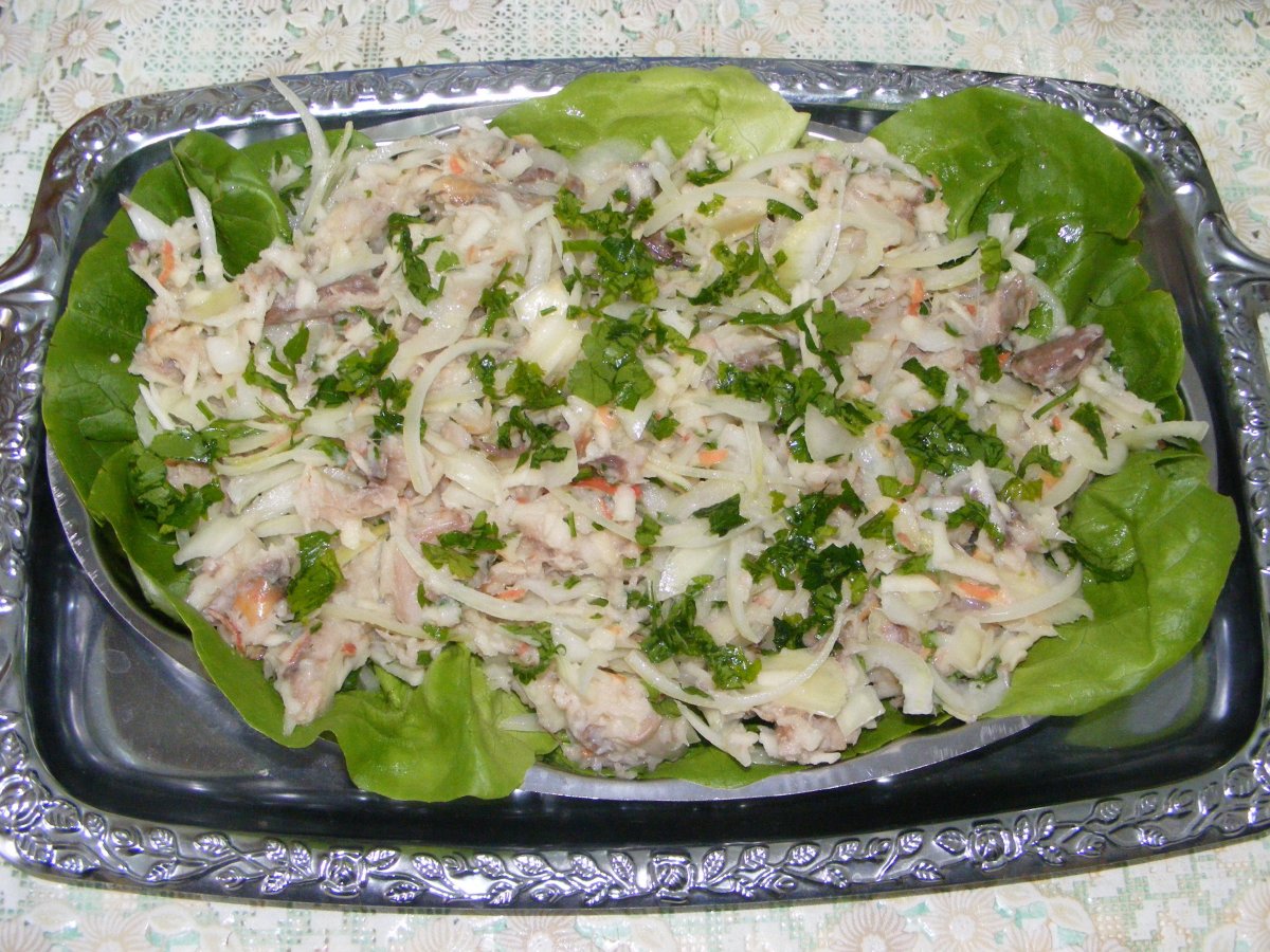 O salata usor de preparat din ingrediente aflate la indemana oricui. Totul se prepara la rece. Gustul de peste afumat se armonizeaza discret cu cel de ceapa spalata si mar. completandu-se cu cel de otet. Patrunjelul si salata verde inveselesc amestecul si creeaza senzatia de curiozitate culinara.