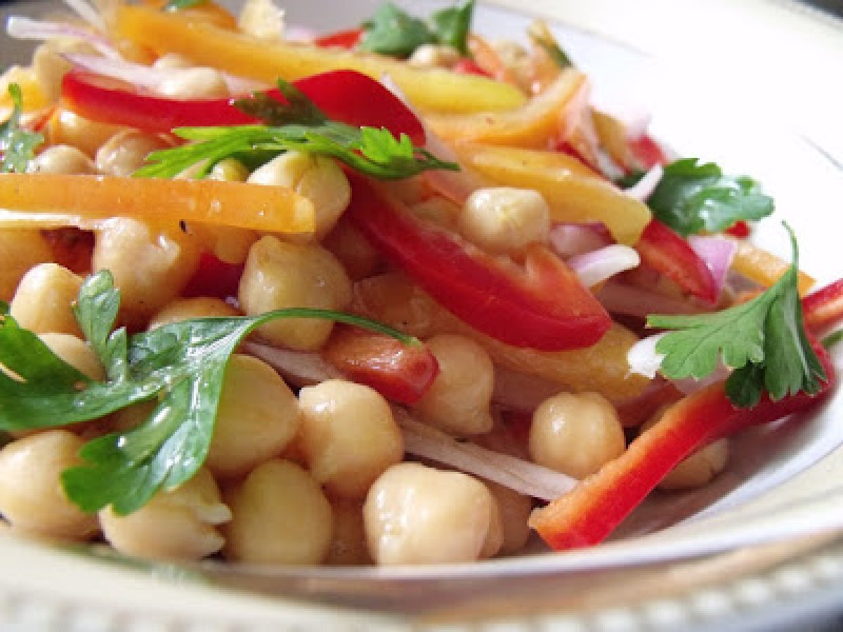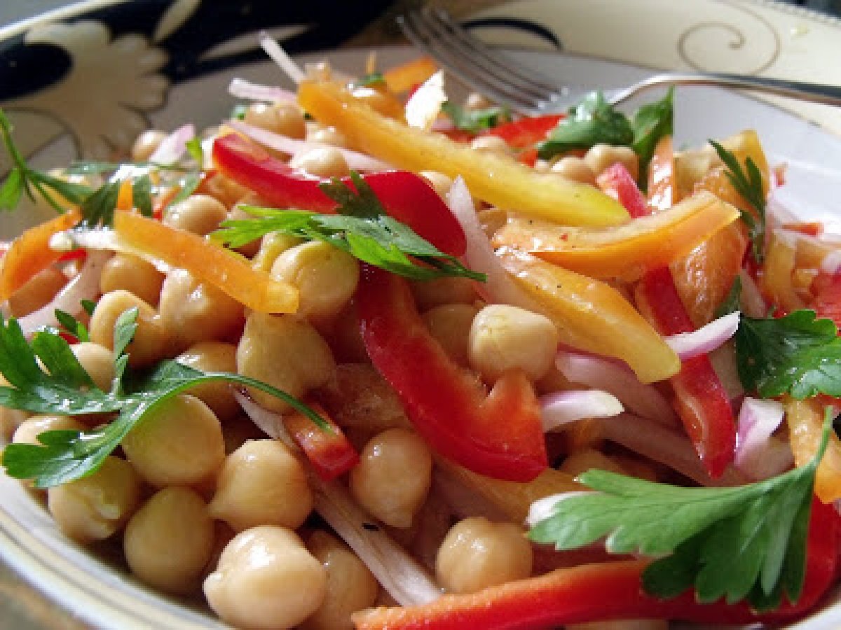 Salata de naut cu ardei (chickpea&peppers salad) PrecedentulUrmătorul AntreuriFoarte ușor35 min Trimite unui prieten Printează pagina Adresează o întrebare autorului Postează o poză cu rețeta gătită de tine Ingrediente 6 300 grame de naut,fiert,scurs de zeama, un buchetel mic de patrunjel, 2-3 ardei grasi,taiati julien, 1 ceapa rosie ,taiata julien, optional,citiva fulgi de chili.