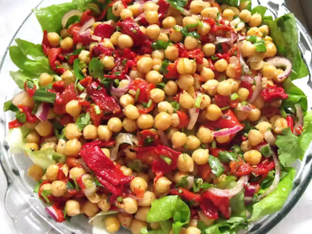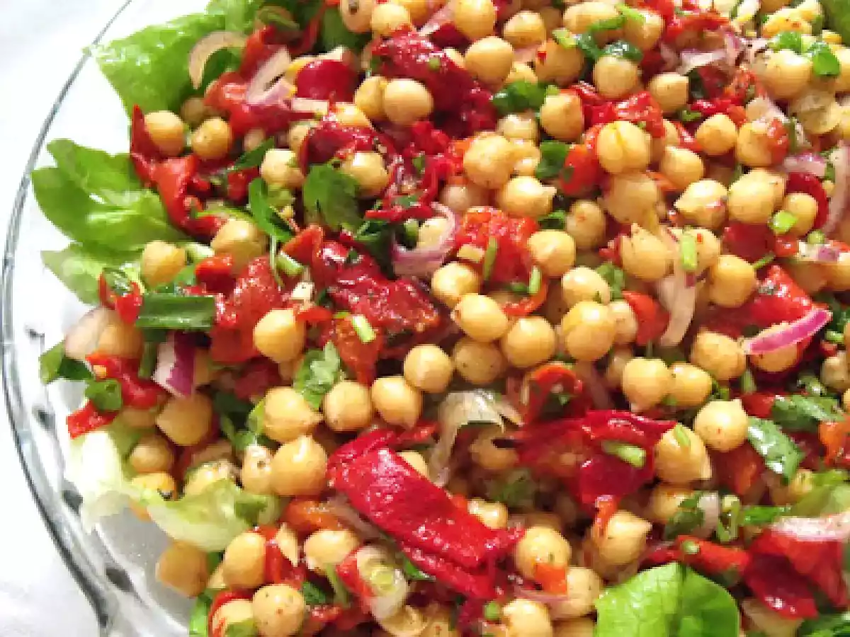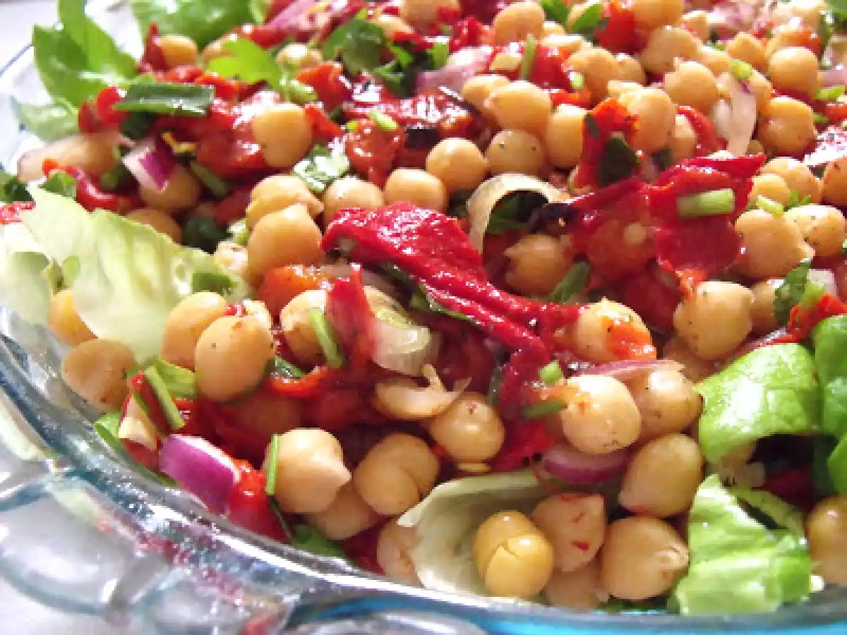 Salata de naut cu ardei kapia copti(chickpea salad with roasted pimiento) PrecedentulUrmătorul AntreuriFoarte ușor1 oră Trimite unui prieten Printează pagina Adresează o întrebare autorului Postează o poză cu rețeta gătită de tine Ingrediente 10 400 g naut fiert,scurs bine de apa, 300 g ardei kapia copti,curatati de pielite,cotoare,seminte,taiati fisii 1 ceapa rosie mare,taiata julien 3 fire ceapa verde,tocata 1 legatura de patrunjel,tocata 3 -4 linguri ulei de masline 2 linguri otet alb sare,piper.