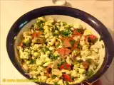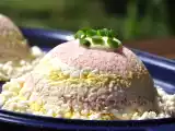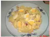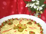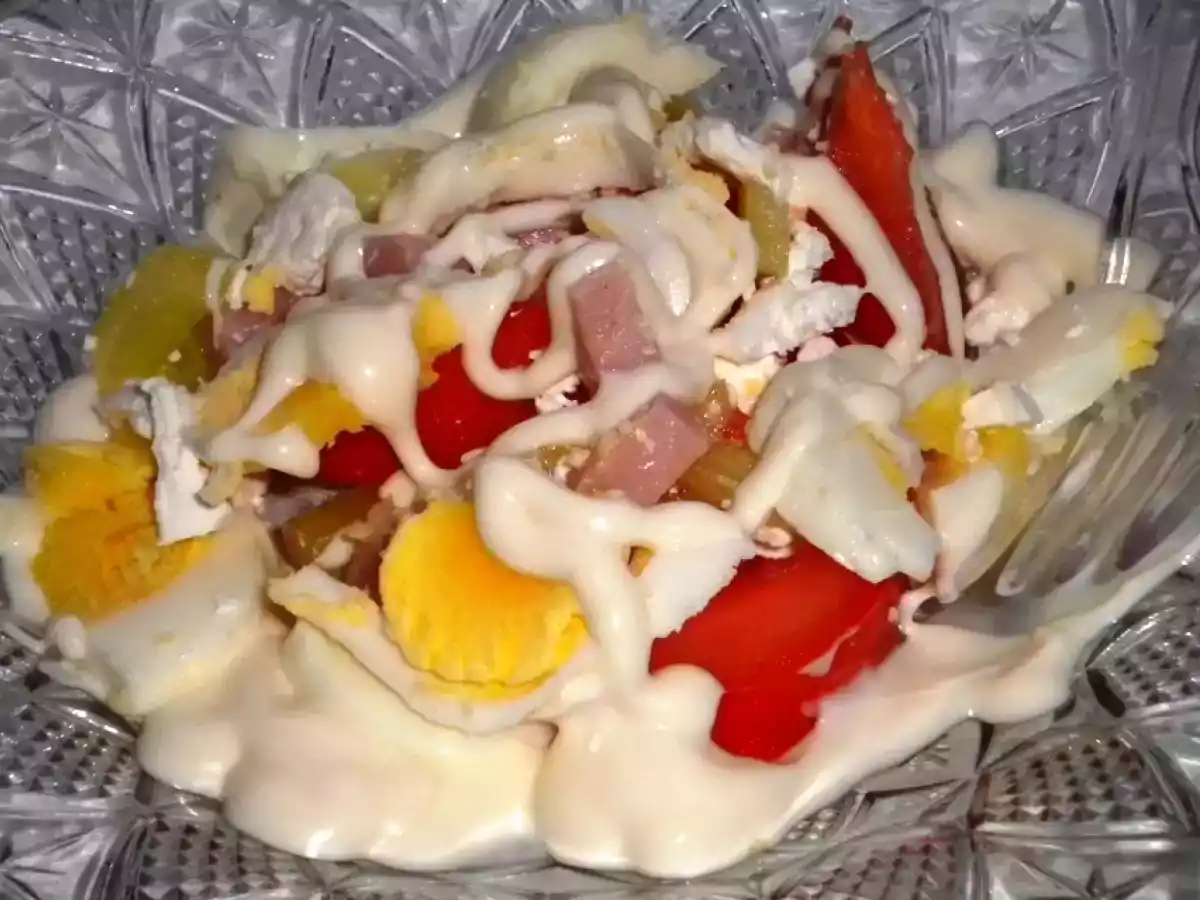Salata de oua germana AntreuriFoarte ușor15 min145 Kcal Trimite unui prieten Printează pagina Adresează o întrebare autorului Postează o poză cu rețeta gătită de tine Ingrediente 1 2 oua fierte, un praf de zahar (optional), salata verde mare sau o rosie, maioneza, 50 g sunca, zeama de lamaie, sare, piper, 5 masline, cascaval ras pt decor. Cost estimat: 0.3Euros€ (0.3€/porție)
