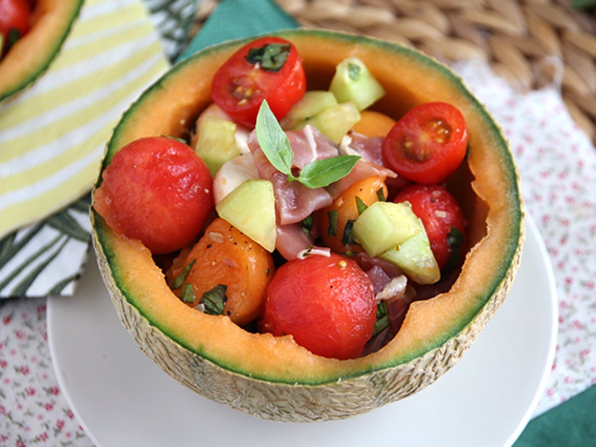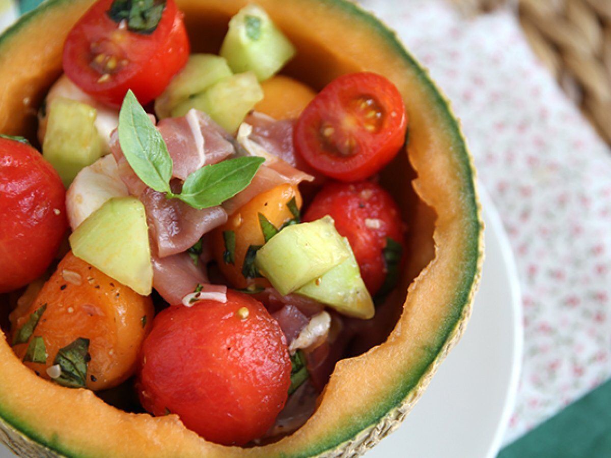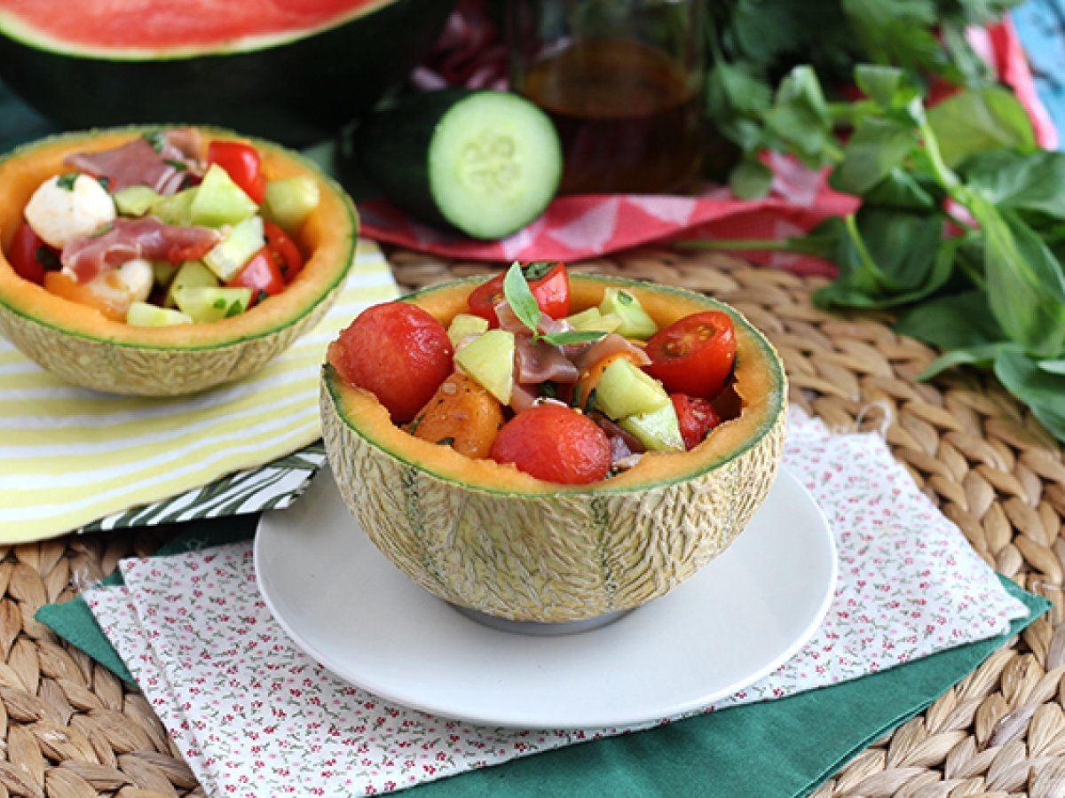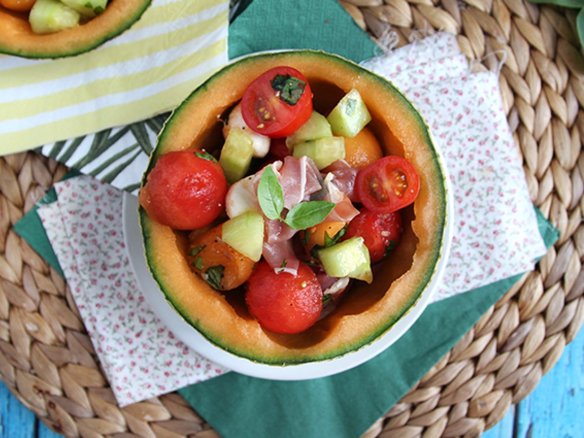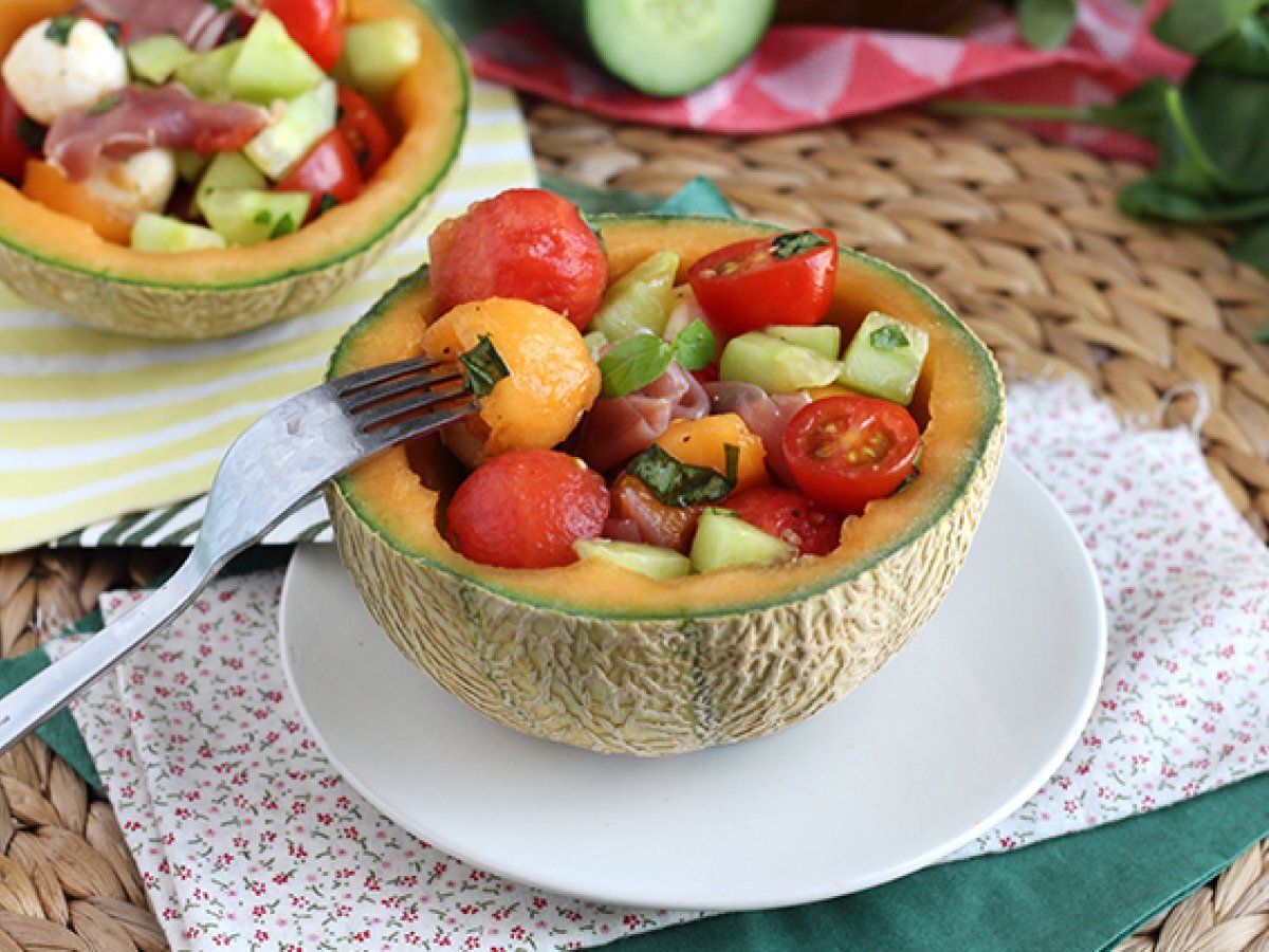Ce ne place sa consumam cel mai mult vara? Pepene galben si pepene verde! Si uite asa, ne-a venit o idee sa facem o salata! Pentru a face acest preparat si mai irezistibil, adaugati bile de mozzarella, cateva rosii cherry si sunca Serrano taiate in bucăți. Serviti direct in coaja pepenelui pentru o prezentare la fel de frumoasa, pe cat este de originala :-)