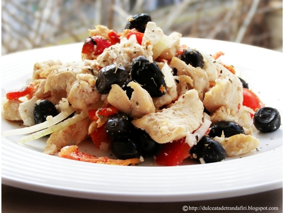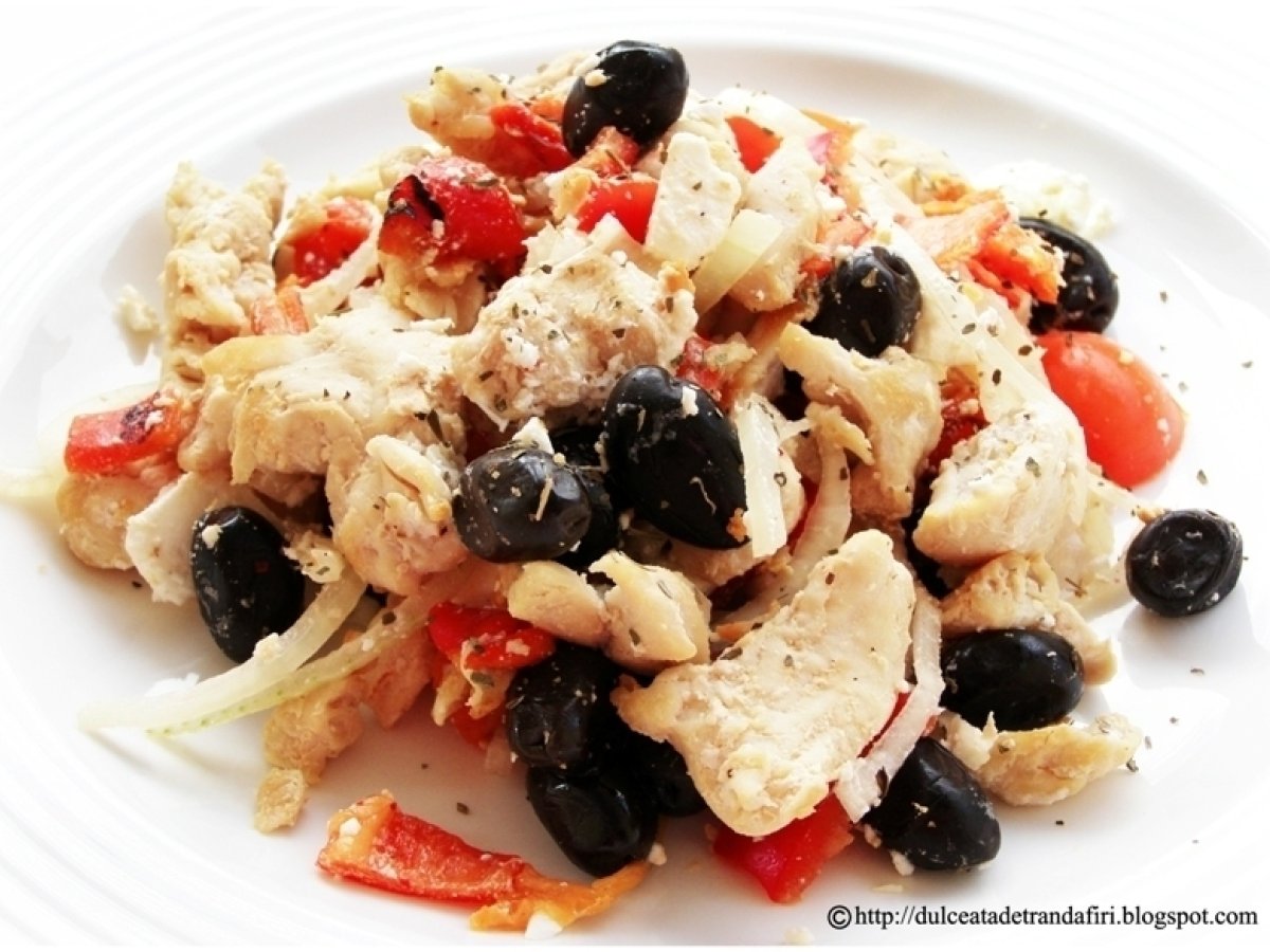 Salata de pui cu ardei copti PrecedentulUrmătorul AntreuriFoarte ușor25 min Trimite unui prieten Printează pagina Adresează o întrebare autorului Postează o poză cu rețeta gătită de tine Ingrediente 3 Ingrediente pentru 3-4 portii: 1. 700 gr piept de pui taiat cubulete 2. 3-4 linguri de masline negre, sarate 3. 3 ardei copti (la borcan, in otet) 4. 1 ardei gras mic si rosu 5. 10 rosii cherry 6. o ceapa mica 7. 2 felii groase de branza feta 8. jumatate de lingura de busuioc uscat (ori verde si tocat marunt) 9. sare, piper 10. paine prajita