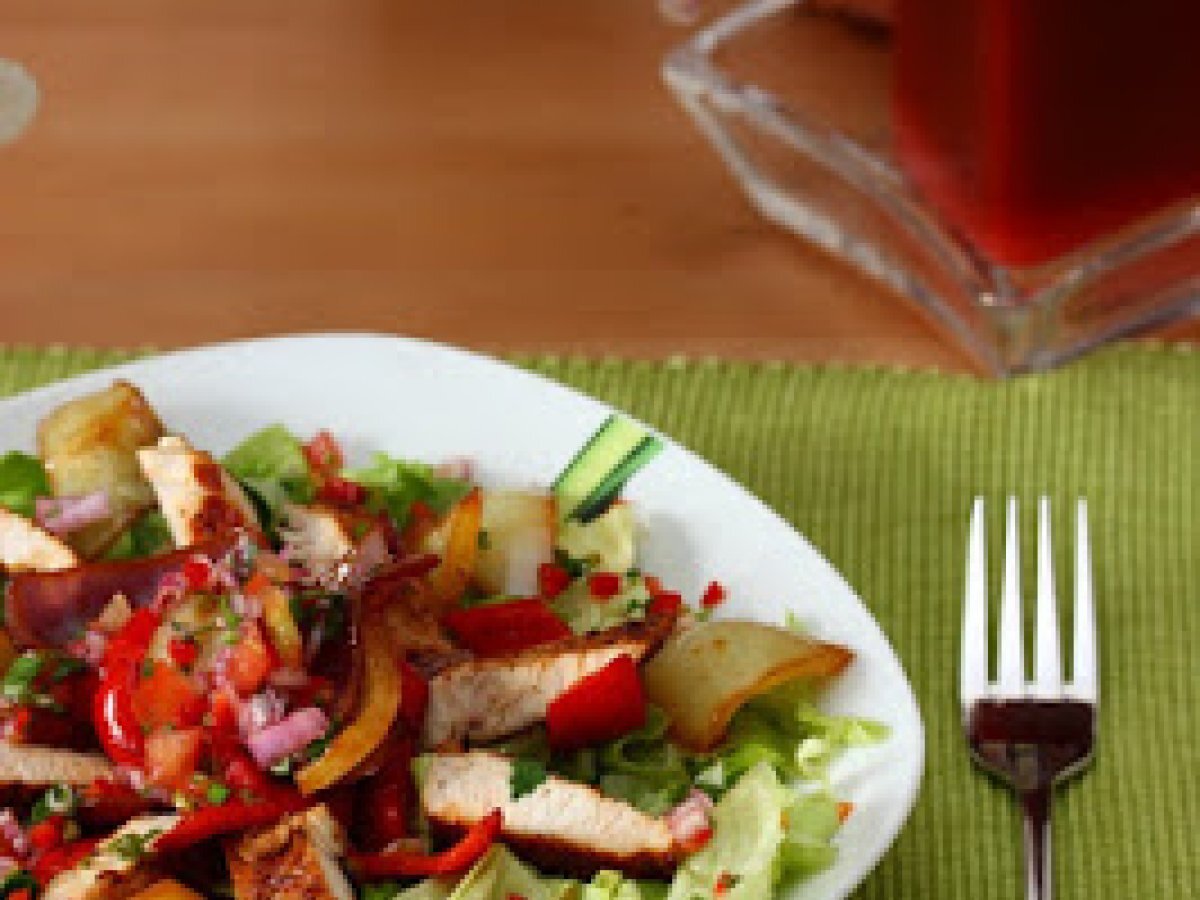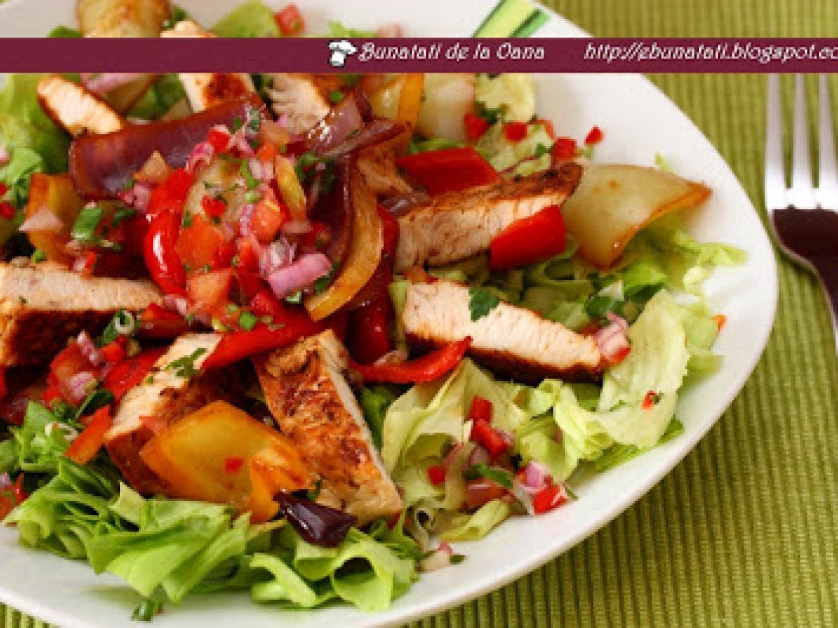 Salata de pui "piri-piri" cu legume coapte PrecedentulUrmătorul AntreuriFoarte ușor35 min216 Kcal Trimite unui prieten Printează pagina Adresează o întrebare autorului Postează o poză cu rețeta gătită de tine Ingrediente 6 un piept de pui jumatate de salata verde Marinata : 3 catei de usturoi, 1/2 ardei iute , 3-4 linguri de ulei, sare si piper in functie de preferinte Legume pentru copt : un ardei gras rosu 1 ardei gras galben o ceapa rosie mare Pentru sos : miezul de la ceapa rosie de mai sus 1/2 ardei iute o rosie micuta o felie ardei rosu 2 catei de usturoi zeama de la o lamaie 2 linguri de patrunjel proaspat tocat 1 lingura ulei de masline Cost estimat: 6.59Euros€ (1.1€/porție)