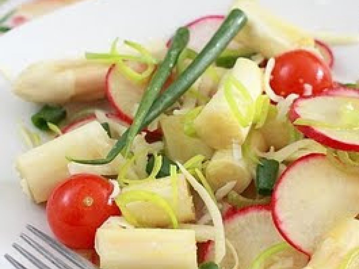 Salata de sparanghel si ridichi AntreuriFoarte ușor25 min Trimite unui prieten Printează pagina Adresează o întrebare autorului Postează o poză cu rețeta gătită de tine Ingrediente 4 500 g sparanghel alb 150 g rosii cherry 1 legatura ridichi 1 praz mediu 2-3 cepe verzi ~100 g cascaval cedar 3 linguri otet 3 linguri ulei 4 lingurite mustar clasic 1 lingurita zahar sare, piper